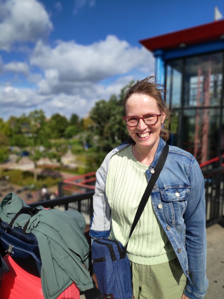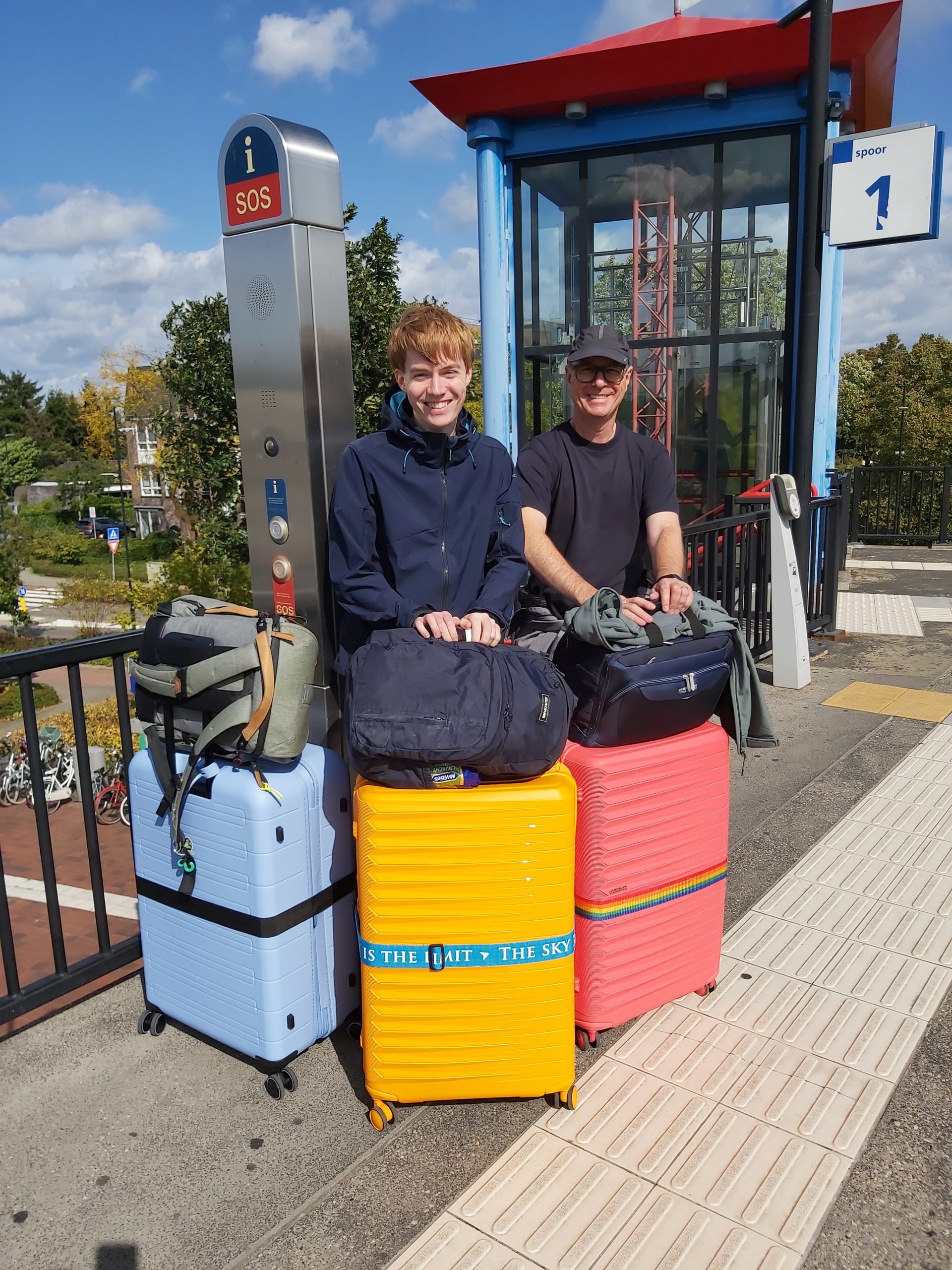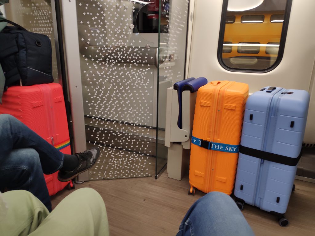 We trekken nogal wat bekijks, zou het iets met de mooie kleuren te maken hebben? Ik word er in ieder geval vrolijk van. Nu zitten we zo’n 2,5 uur in de trein en dan kunnen we op Schiphol weer uitstappen. Tot nu toe is het rustig, goed geregeld!