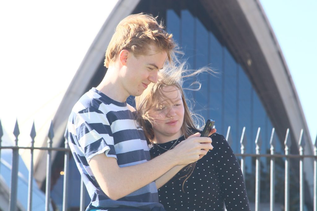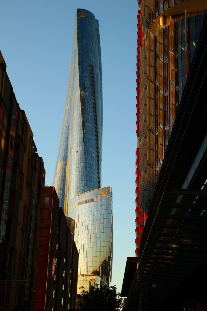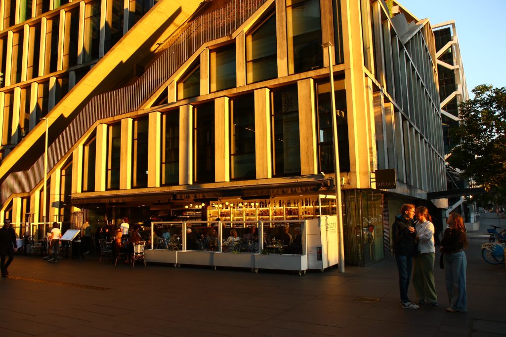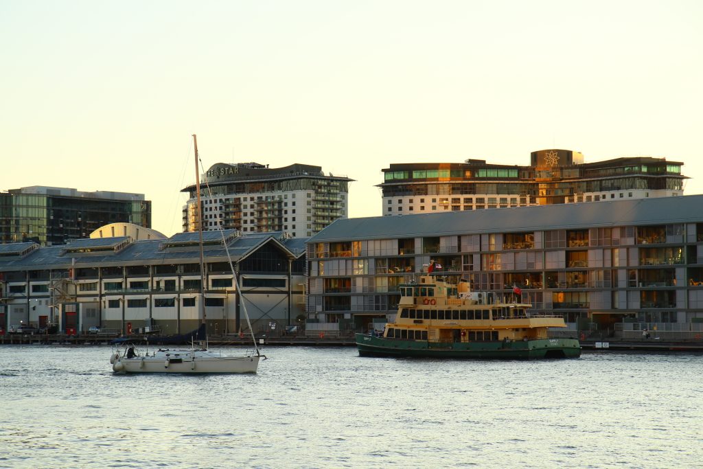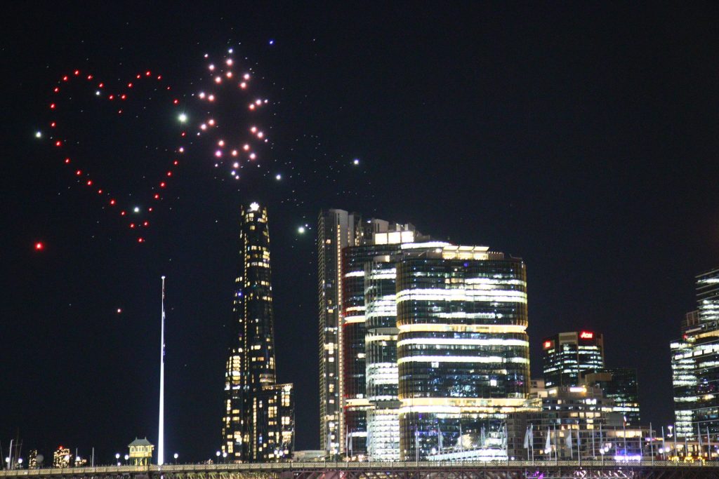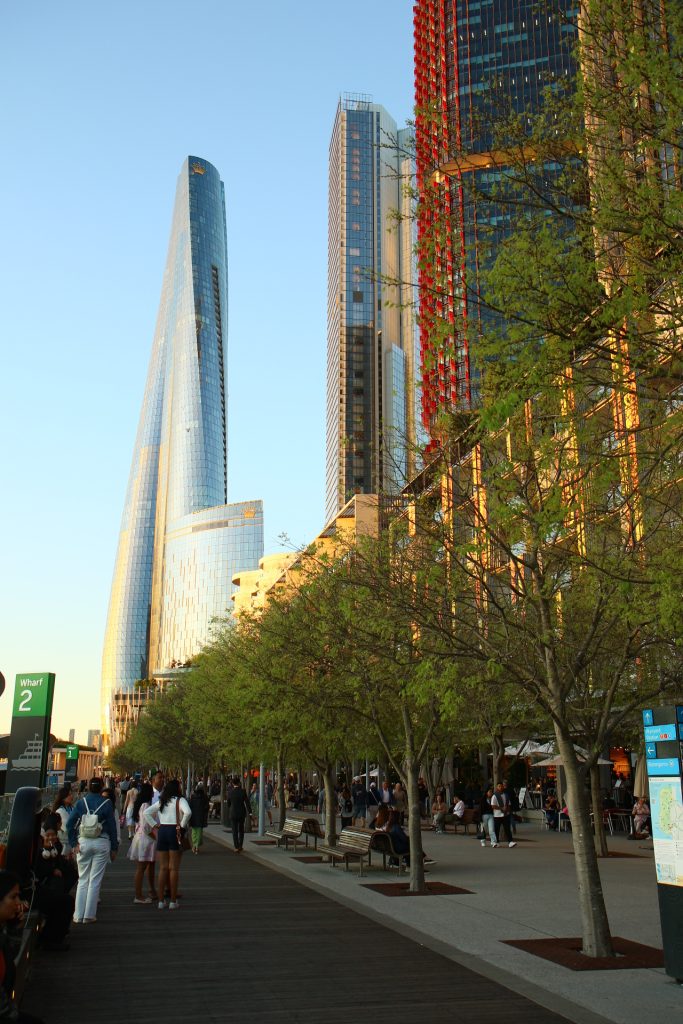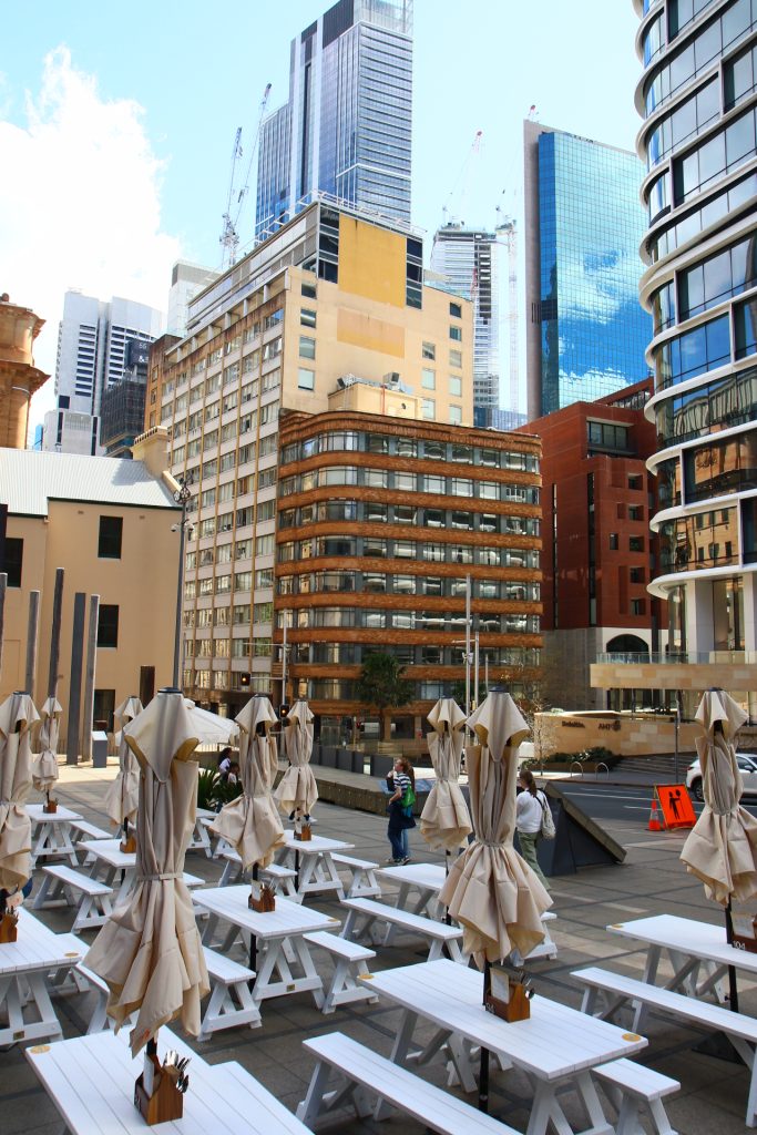 Via de binnenstad – verlaten op zaterdag – naar Darling Harbour, waar later op de avond een drone show is, en Carmen met vriendinnen heeft afgesproken. Om 6 uur wordt ’t snel donker.