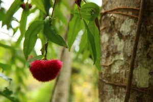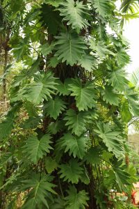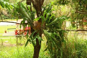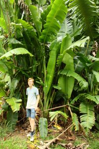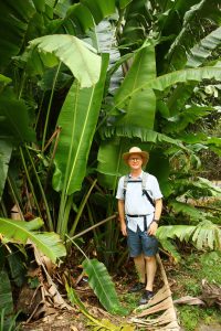 Tenslotte nog een pad door de jungle gelopen. Pad was fijn aangelegd, dus het kapmes kon thuisblijven. Dichte plantengroei, heel veel soorten, grote planten, grote bloemen en zaden.