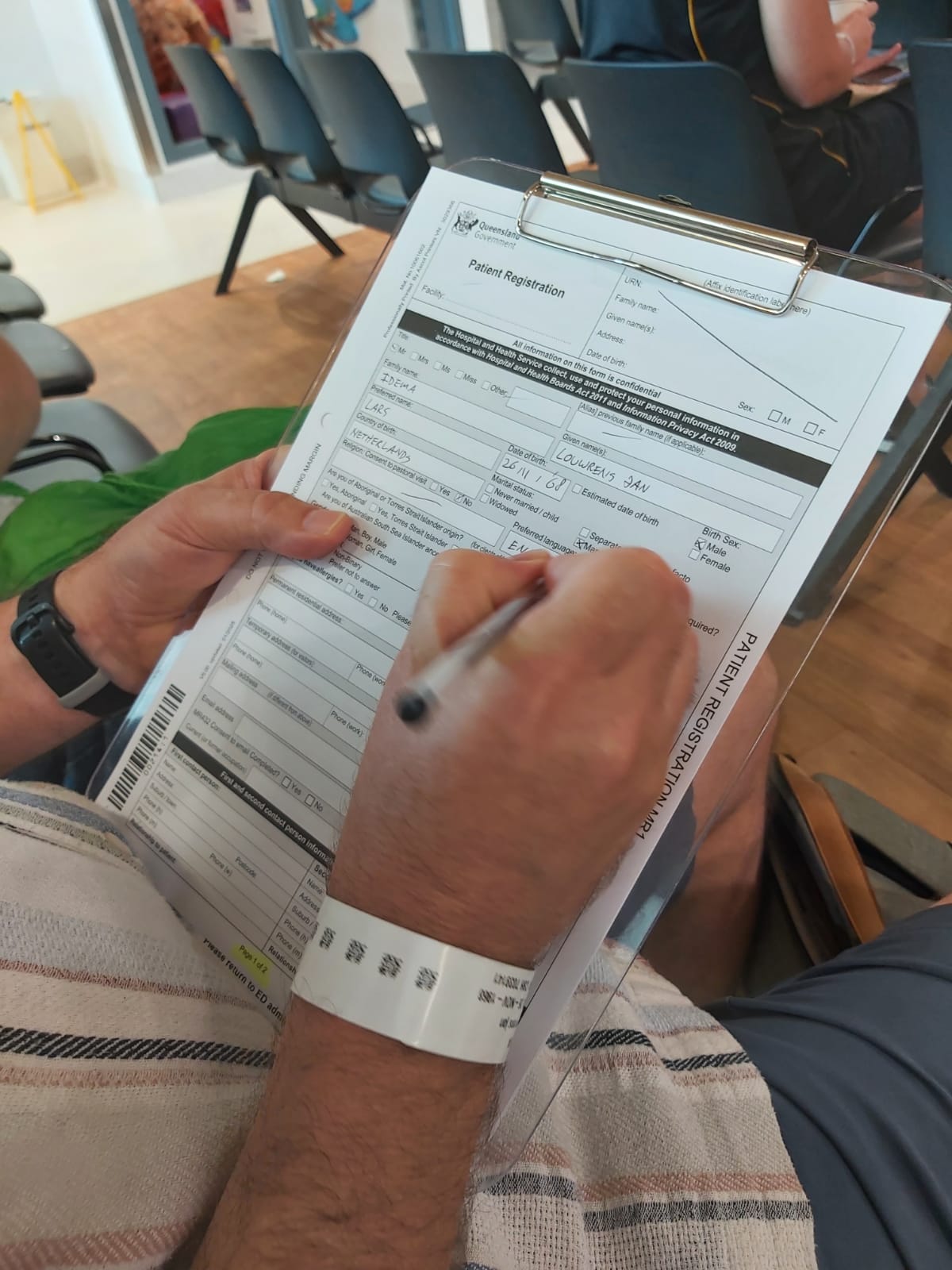 We drongen door tot de cardiologie-afdeling, waar ze ons wat vreemd aankeken. We legden het verhaal uit en een aardige verpleger nam ons mee naar Emergency Dept, de eerste hulp, waar ze letterlijk een loket voor triage hadden. De verpleger hielp wat mee om me vandaag nog te laten checken. Paperasjes ingevuld, en iets later gingen ze checken.