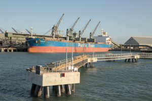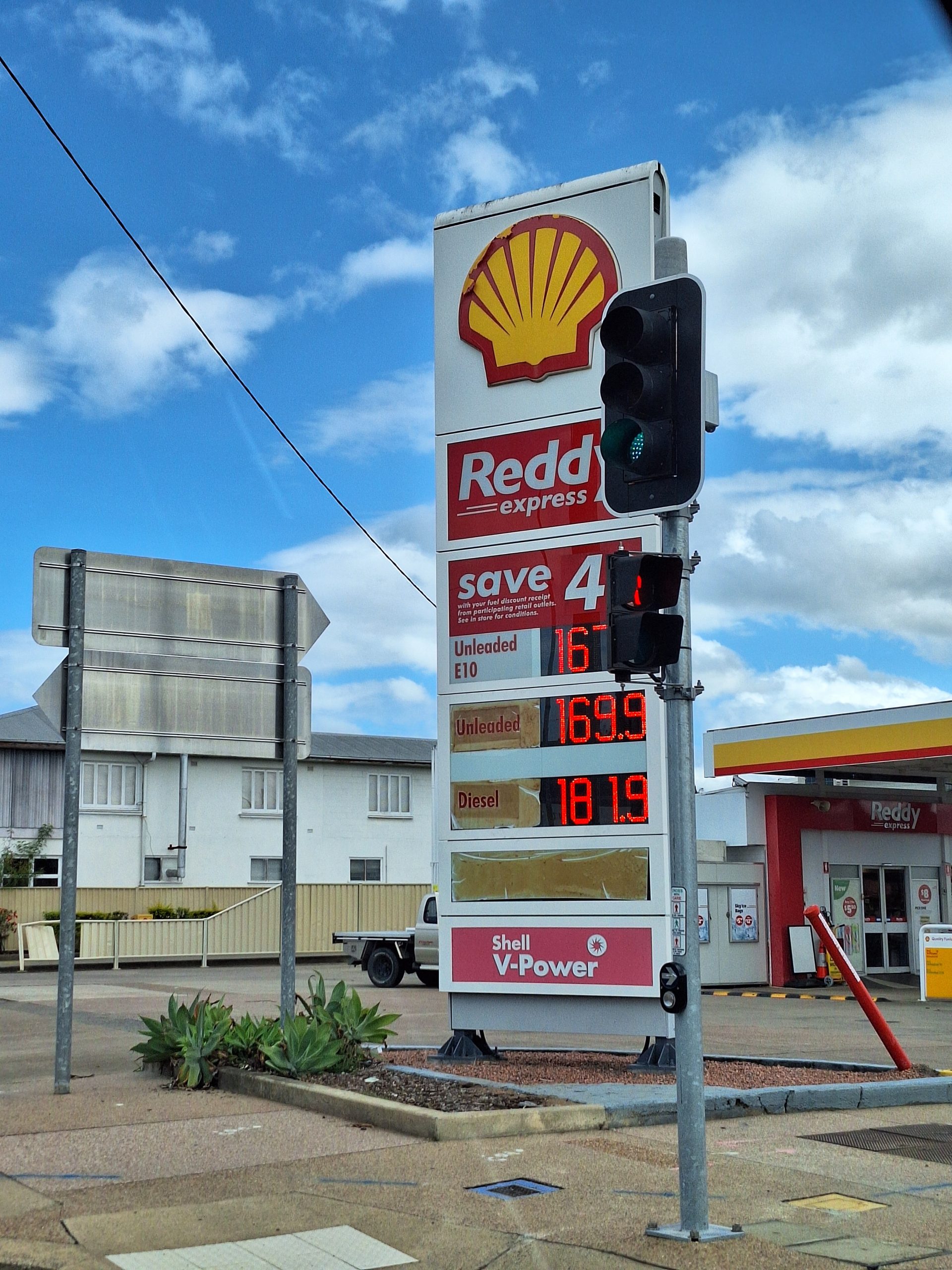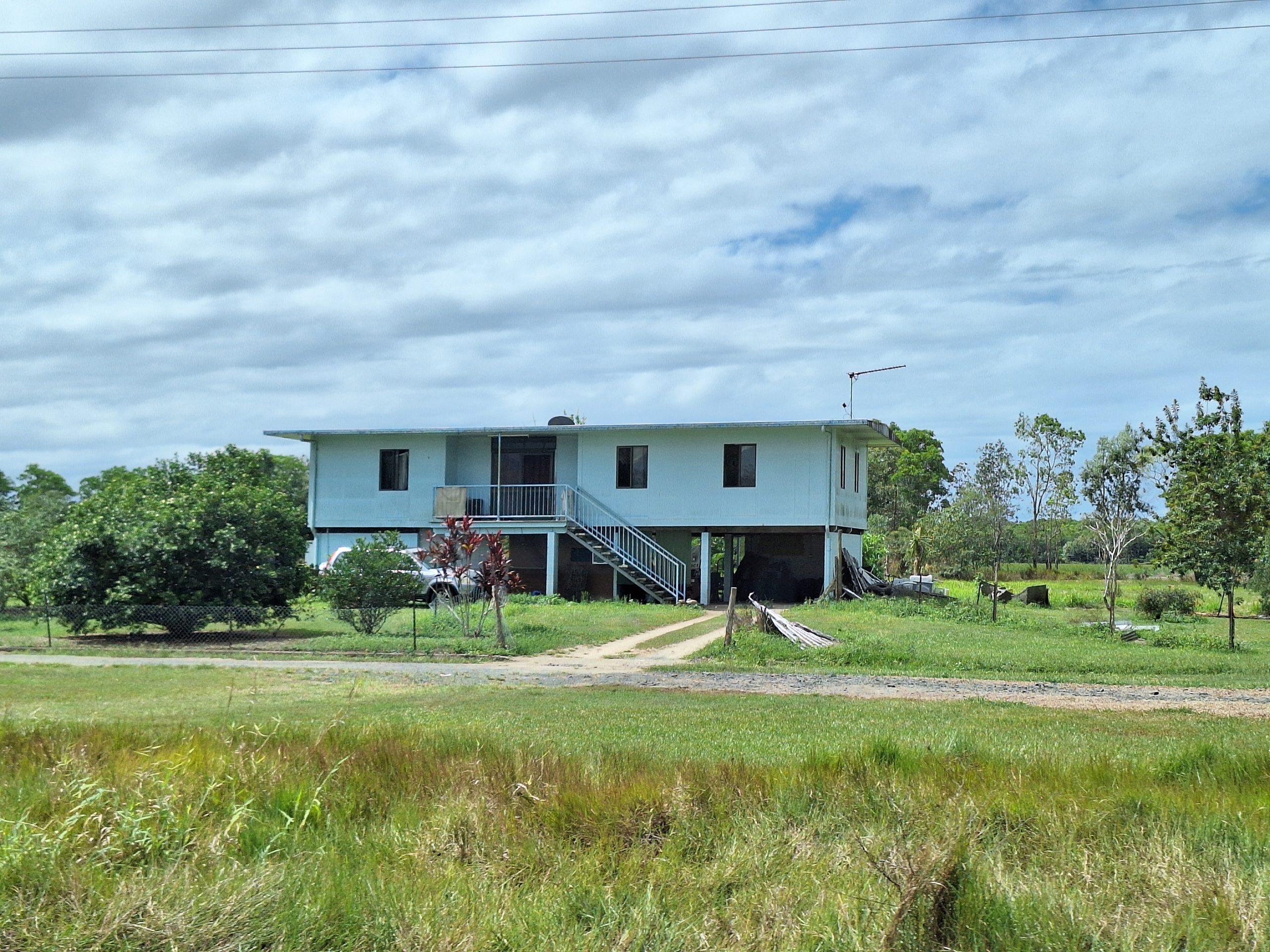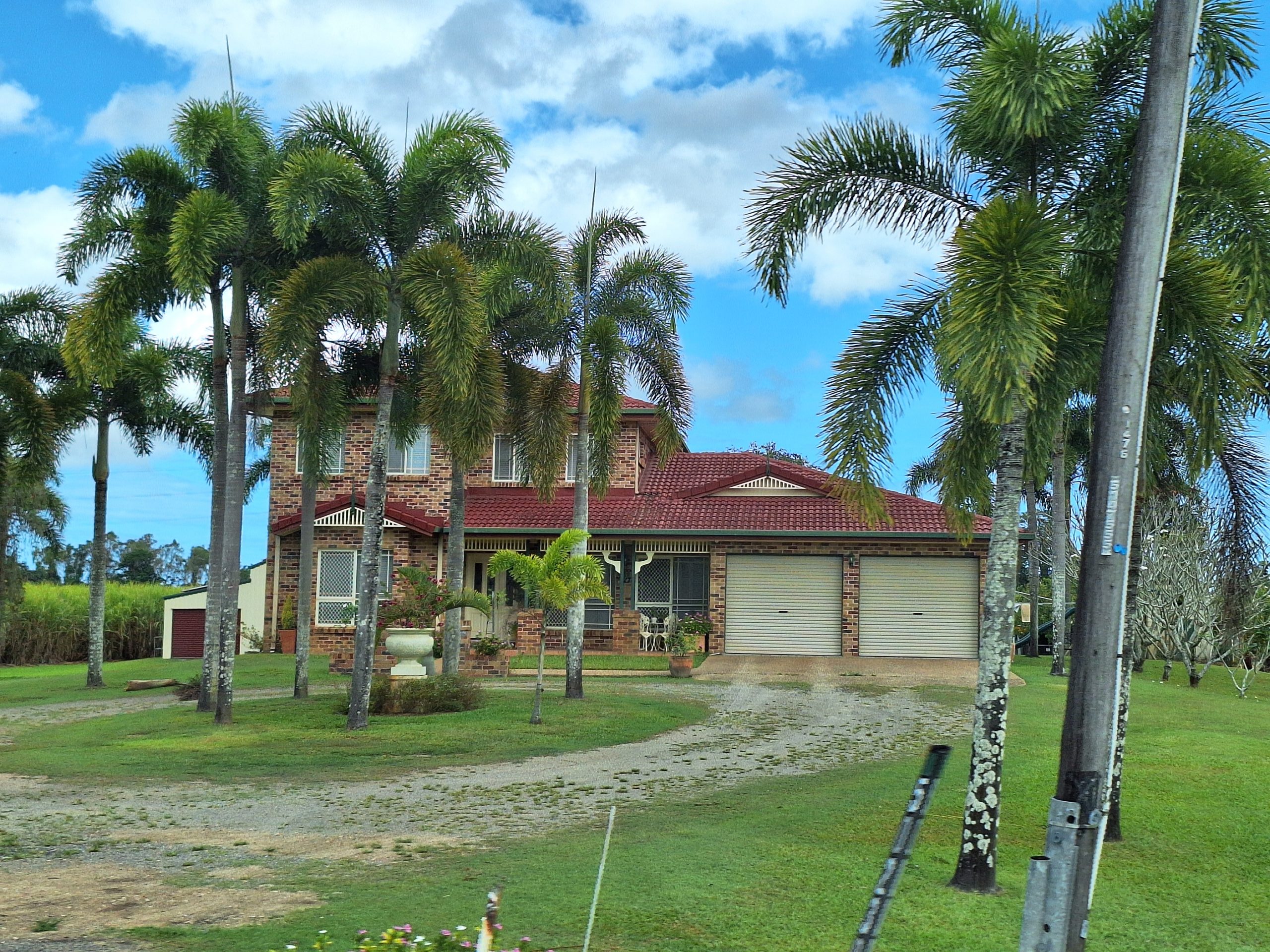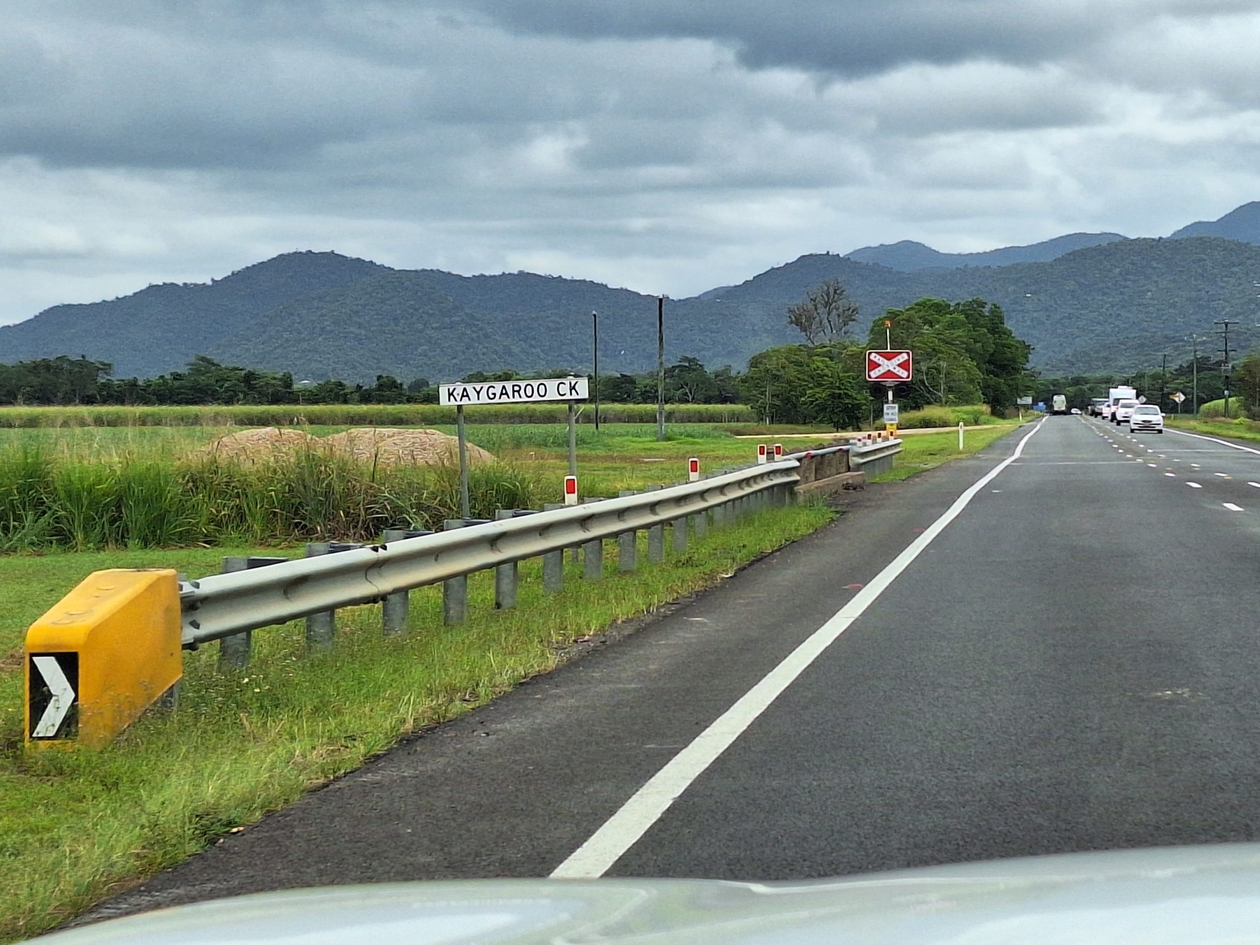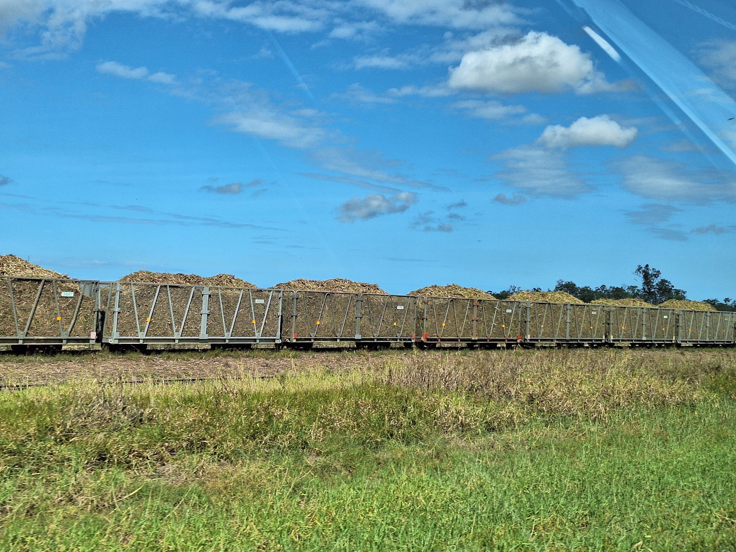 We rijden langs de kust over de A1 Bruce Highway. We rijden langs suikerriet en mangoplantages, langs smalspoorbanen voor suikerriet karretjes.