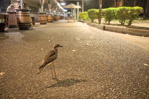 O, ’s avonds zagen we nog een paar rare loopvogels bij het resto, het bedeltype, met hoge poten, kunnen snel lopen.