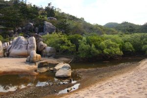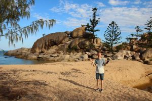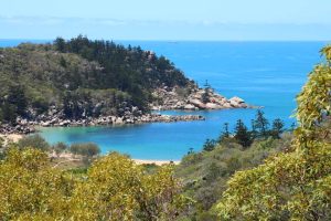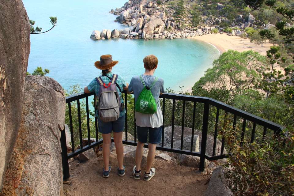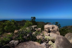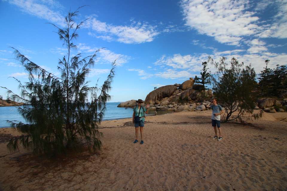 Vanochtend eerst de volgende slaapplek veiliggesteld, bij Airlie Beach. Daarna met de bus naar de hike aan de andere kant van Magnetic Island. Het pad voert naar een oud WO2 fort bovenop de rotsen. Het is 27 C, de zon is heet, maar er zijn bomen langs het pad.