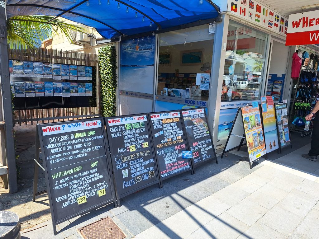 Ook kan je hier in het stadje tripjes boeken, met de boot, jetski, speedboot, vliegtuig, noem maar op, naar een van de Whitsunday eilanden voor de kust.