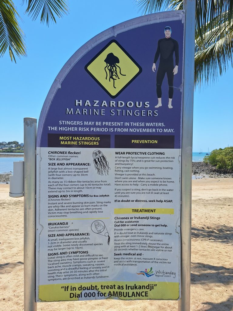 In zee zwemmen is ook niet zo’n goed idee hier: stingers! Nare beestjes! Daar is de azijn dus voor die je bij allerlei stranden vindt. En daarna 000 bellen (112).