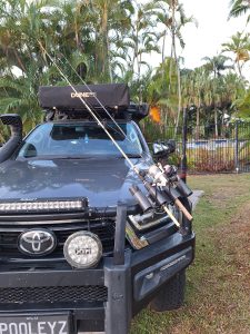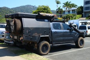 Over auto’s gesproken: dit model zie je ook vaak, kampeerauto met tent bovenop, snorkel, en vishengel-standaard op de gril.