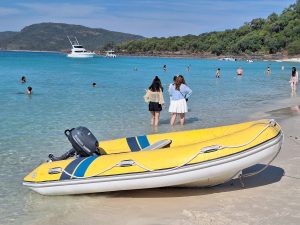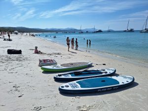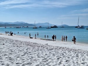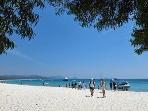 Het strand is parelwit, het zand is heel fijn. Kan je mee polijsten. Maar liefst 8 km lang strand, met bosschages en schaduw langs de kanten. Er zijn de nodige boot clubs die hier een dagtripje aanbieden naar hier!