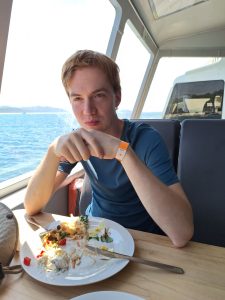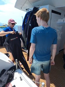 ’s Middags opgesplitst: Arthur gaat snorkelen, wetsuit aan, de boot op naar een buureiland, waar je vanaf het strand kan snorkelen.