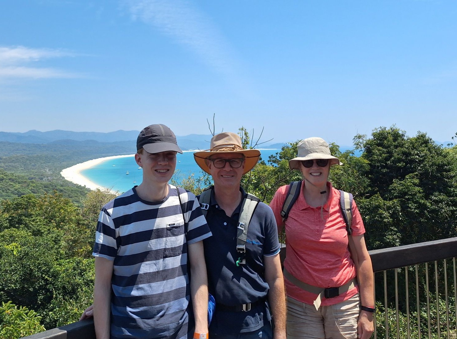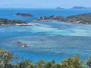 Een kleine heuvel beklommen, hier kijk je uit over het strand, en de baai aan de andere kant van het eiland. Paradijselijk gezicht, zo uit we folder. Of eigenlijk andersom.