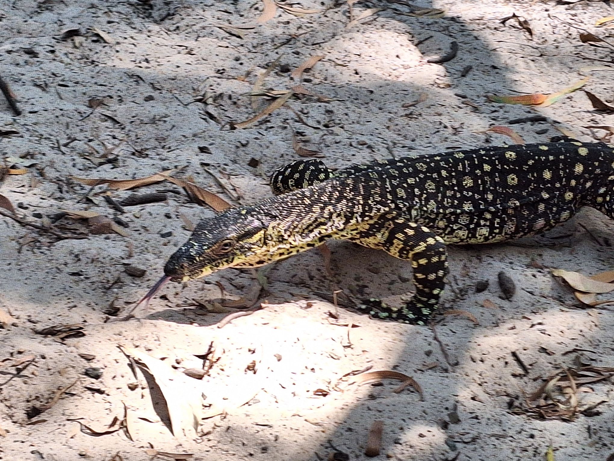 O, naast het strand loopt ook nog dit, metertje of anderhalf. Een Goanna, of ook Australian Monitor Lizard.
