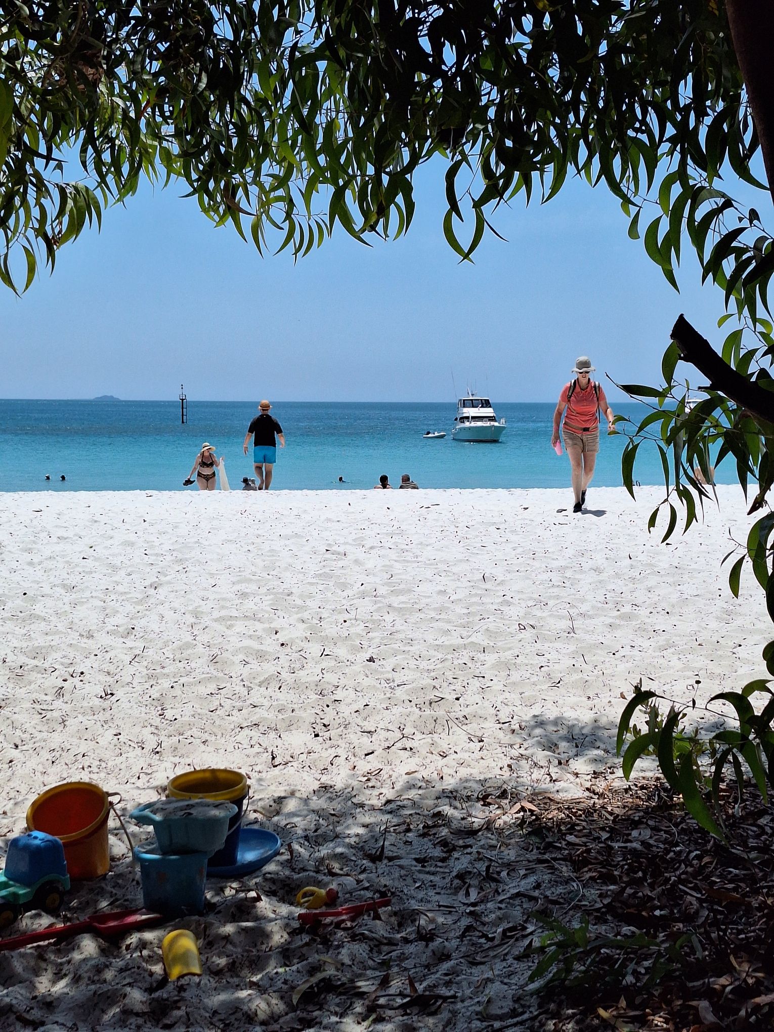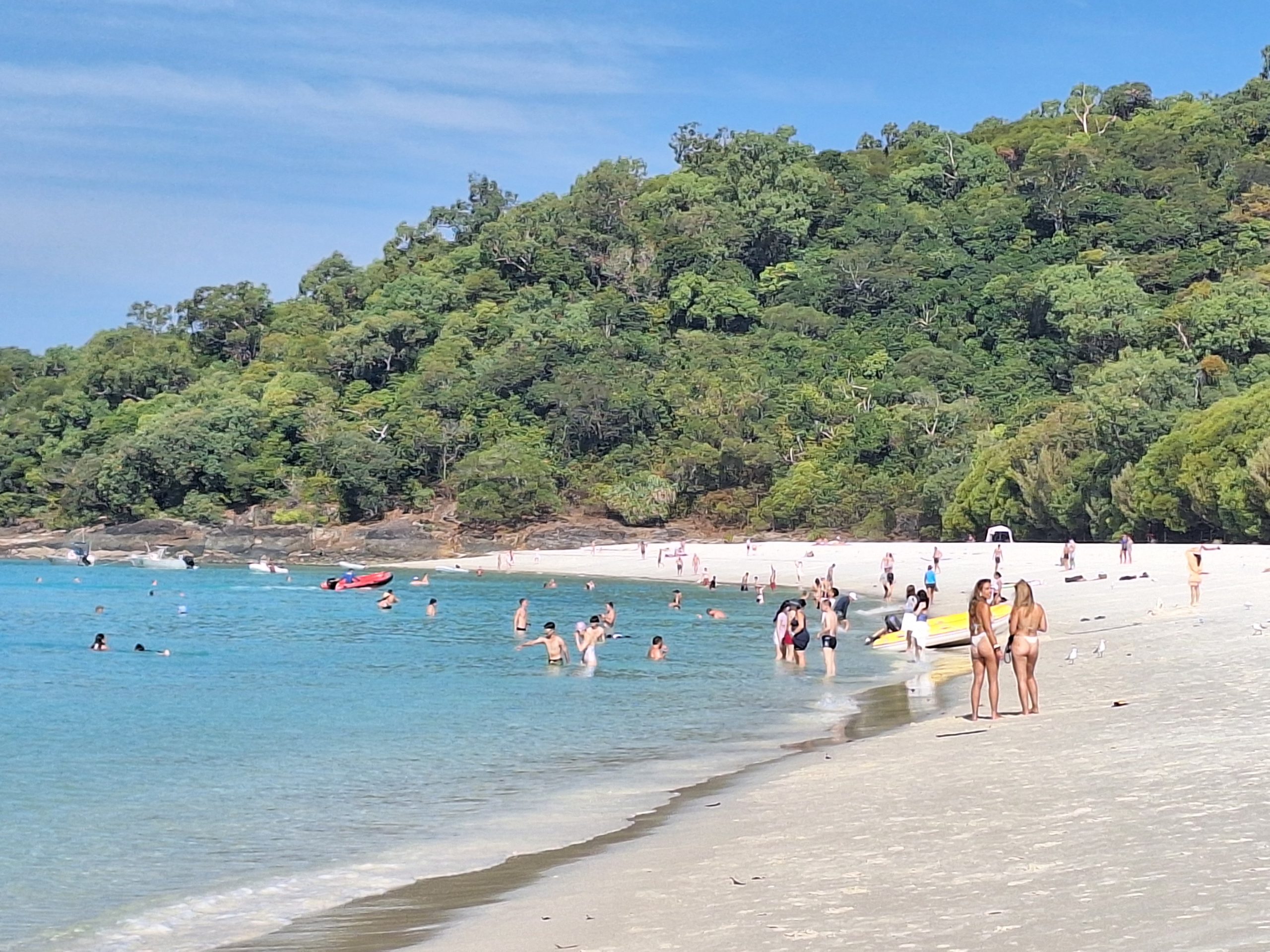 Het strand is parelwit, het zand is heel fijn. Kan je mee polijsten. Maar liefst 8 km lang strand, met bosschages en schaduw langs de kanten. Er zijn de nodige boot clubs die hier een dagtripje aanbieden naar hier!