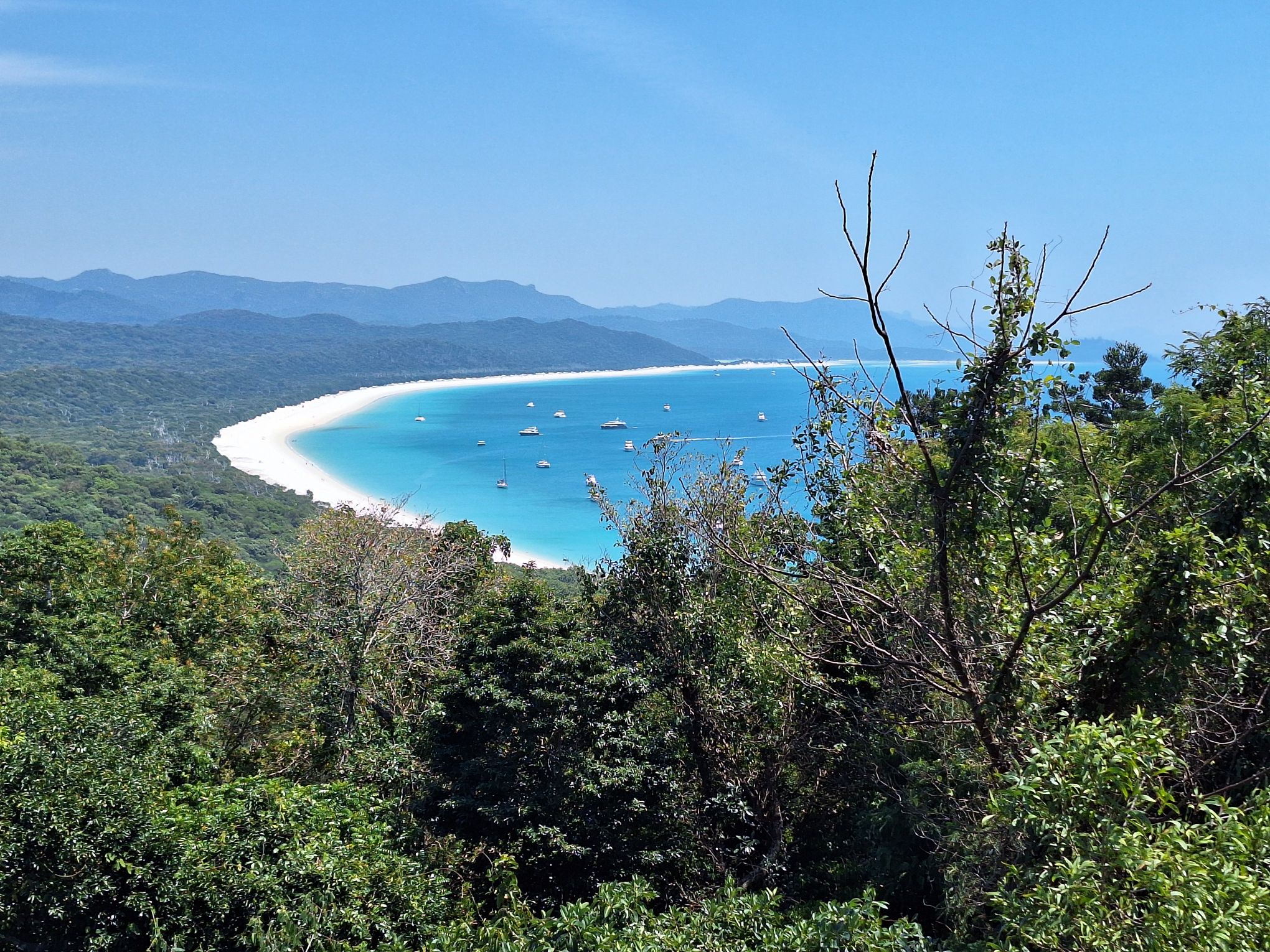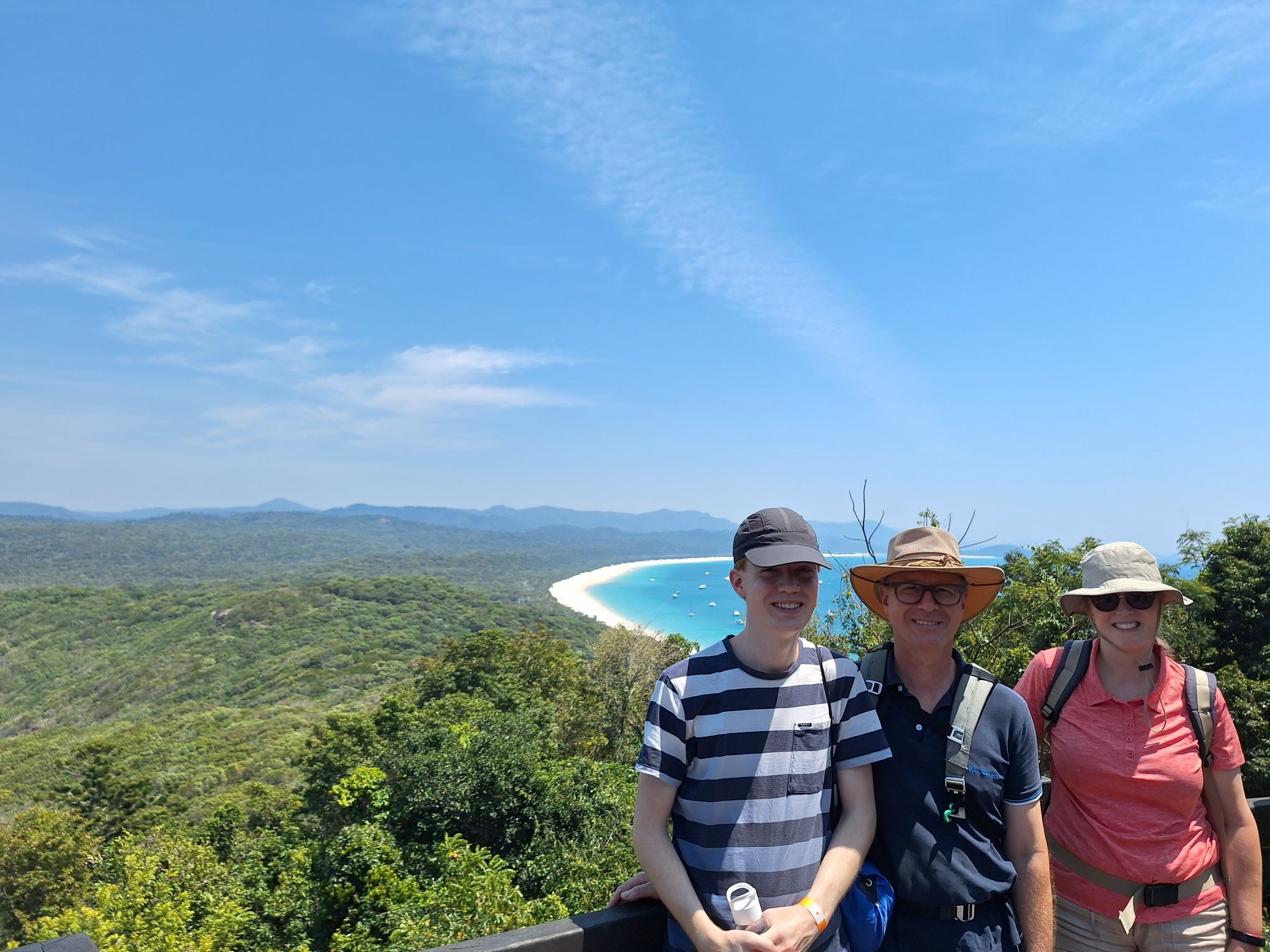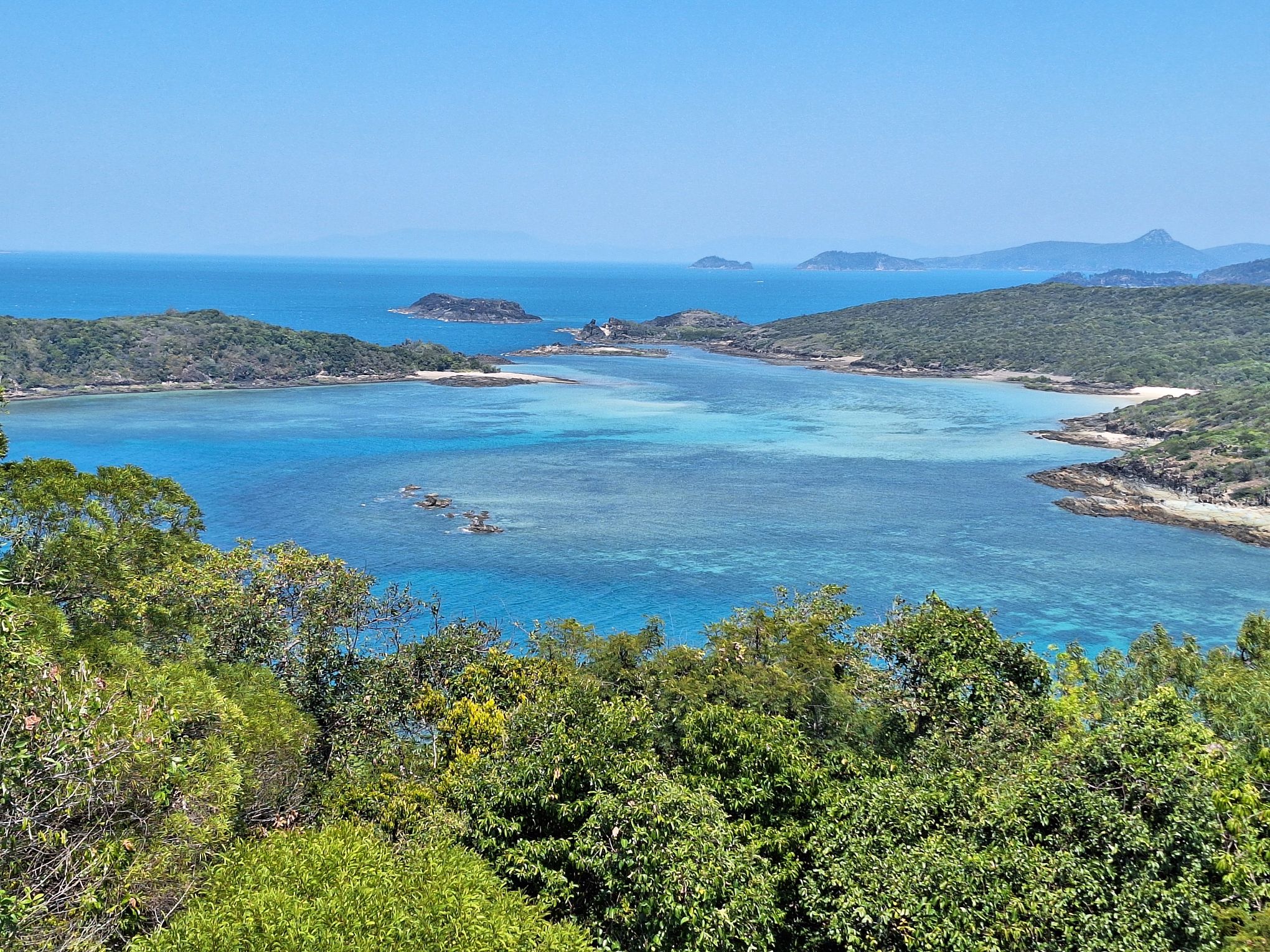 Een kleine heuvel beklommen, hier kijk je uit over het strand, en de baai aan de andere kant van het eiland. Paradijselijk gezicht, zo uit we folder. Of eigenlijk andersom.
