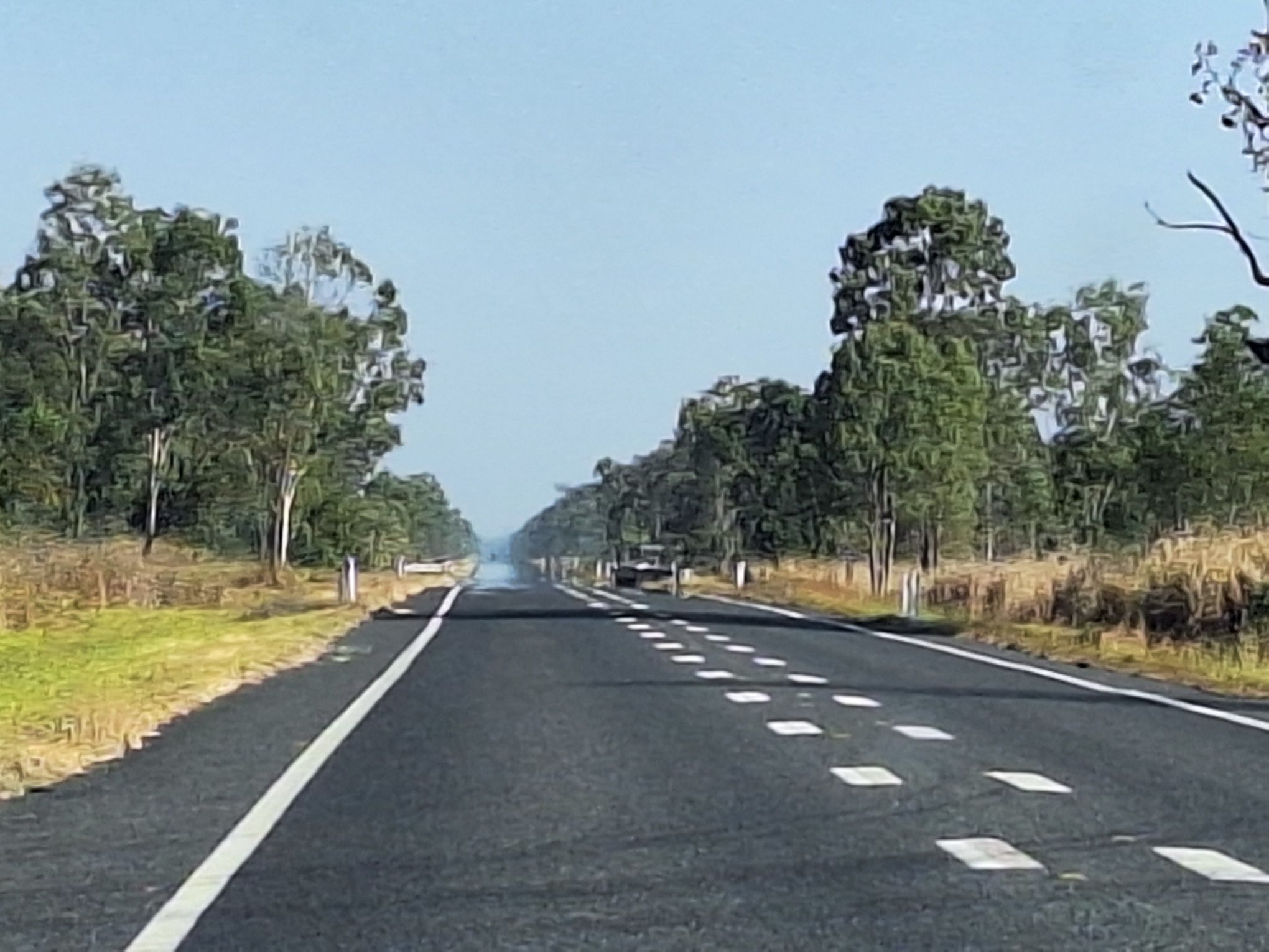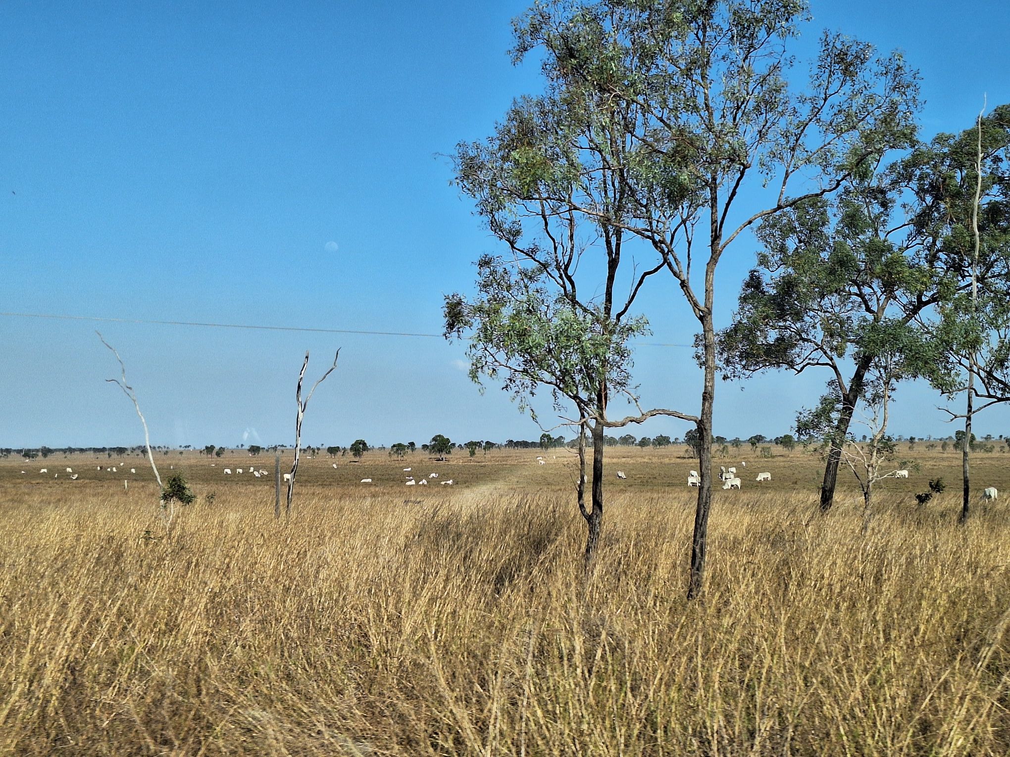 Een half uurtje rijden van Airlie Beach ligt Proserpine, en daaronder is een heel stuk van de oostkust van Australië bijna niet bewoond. Weinig te beleven dan ook onderweg. Elk half uur of uur een dorpje, de eerste helft veel akkers met suikerriet. De laatste 3 uur rijden vooral dor land met veel verspreide bomen. De bomen veranderen van tropische palmen naar meer gewone bomen (zoals wij ze kennen), Eucalyptus en ook naaldbomen. Van dichtbegroeid naar savanne-achtig.