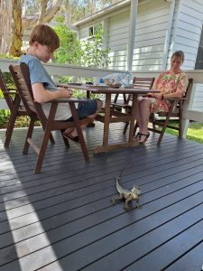 Daarna aan tafel. Snel verzamelen zich een ibis, een kookebarra vogel en een wel hele brutale hagedis. Deze hagedissen kunnen trouwens in geval van nood een uur onder water blijven, las ik. Maar liever zitten ze in het zonnetje op te warmen. Of hij scharrelt onder je, of springt op de stoel naast je. Da’s niet rustig eten meer. Ze eten trouwens vooral insecten, en zijn niet gevaarlijk. Ze hebben natuurlijk wel scherpe nagels en tandjes die ze inzetten als ze het nodig vinden.