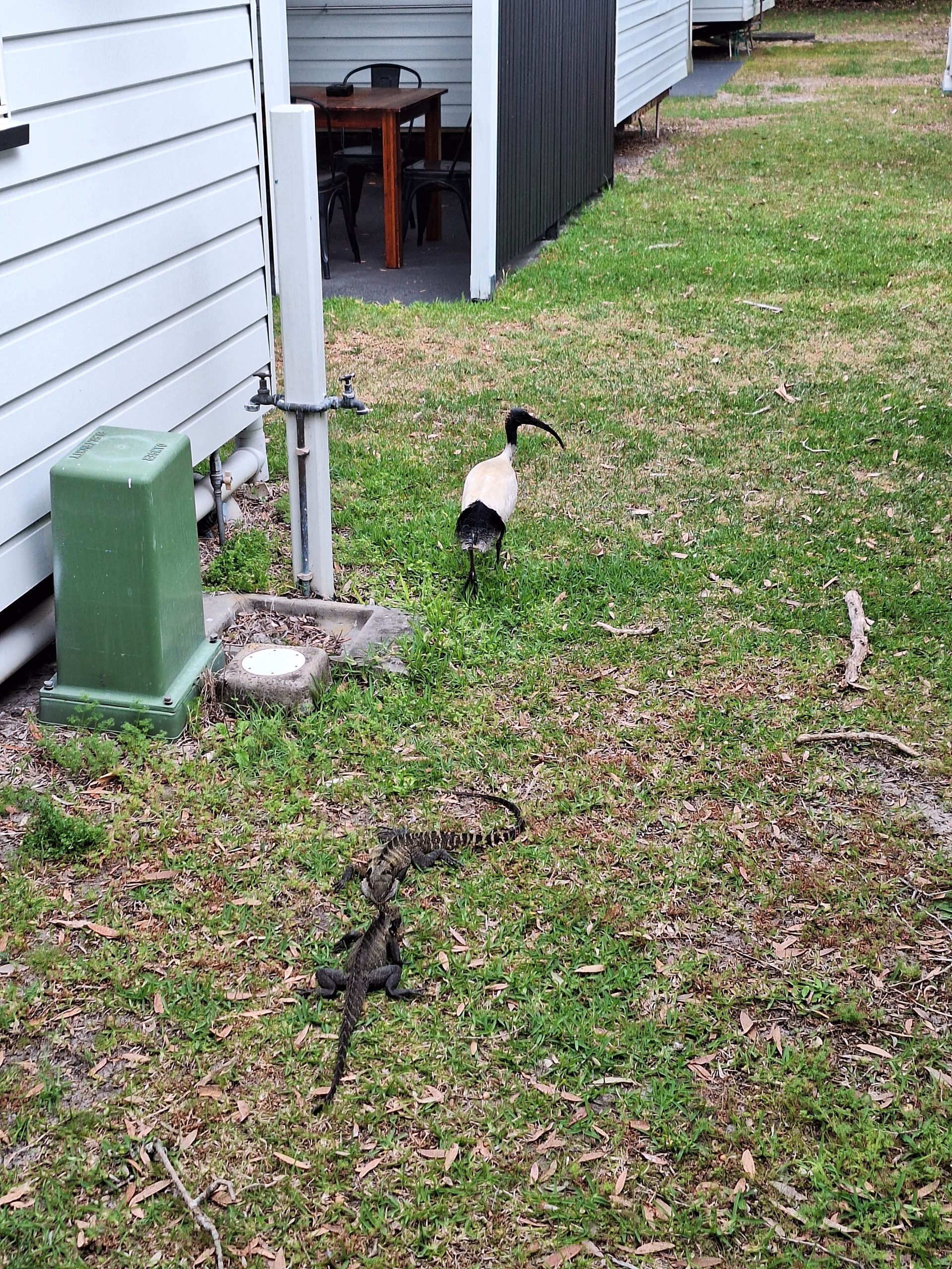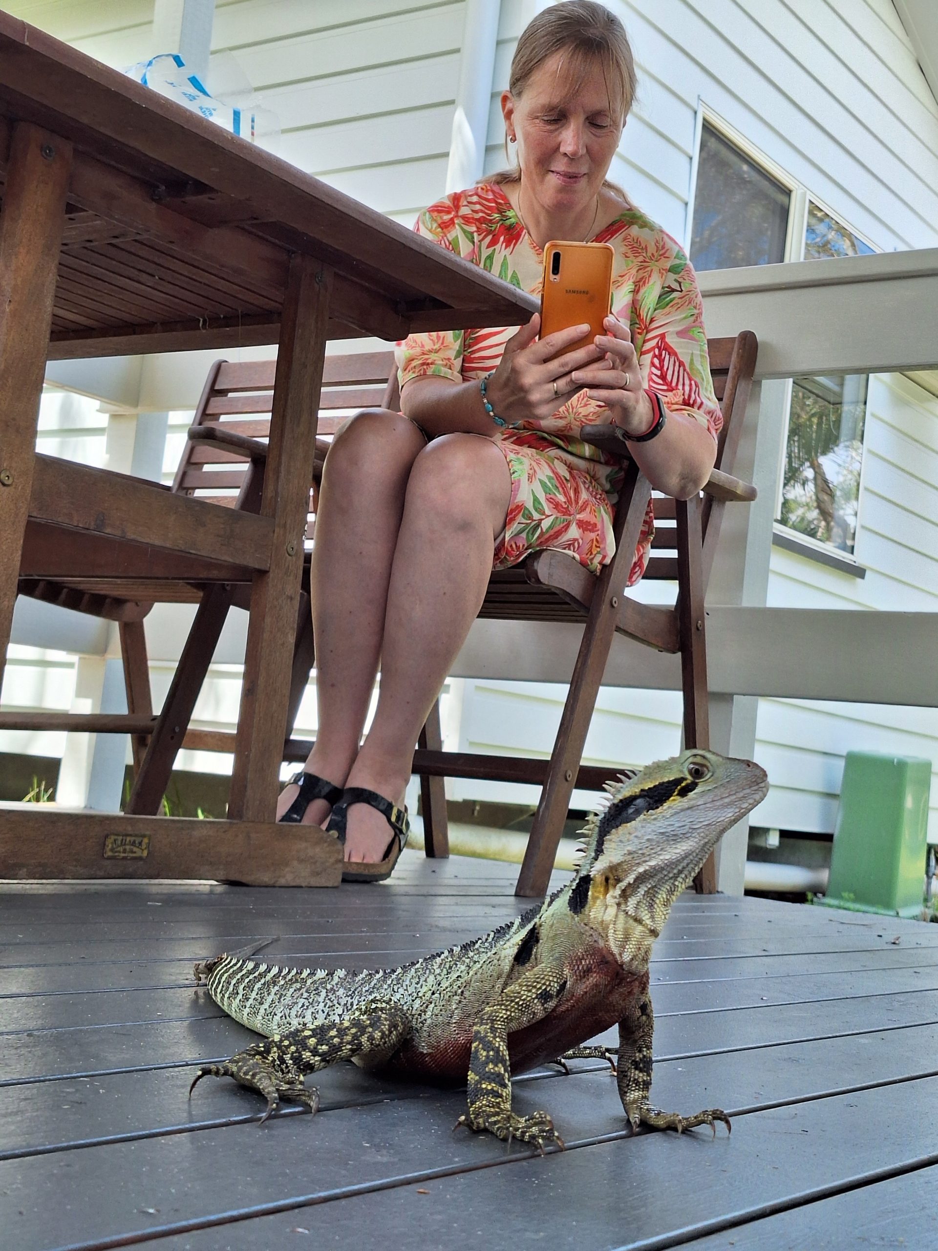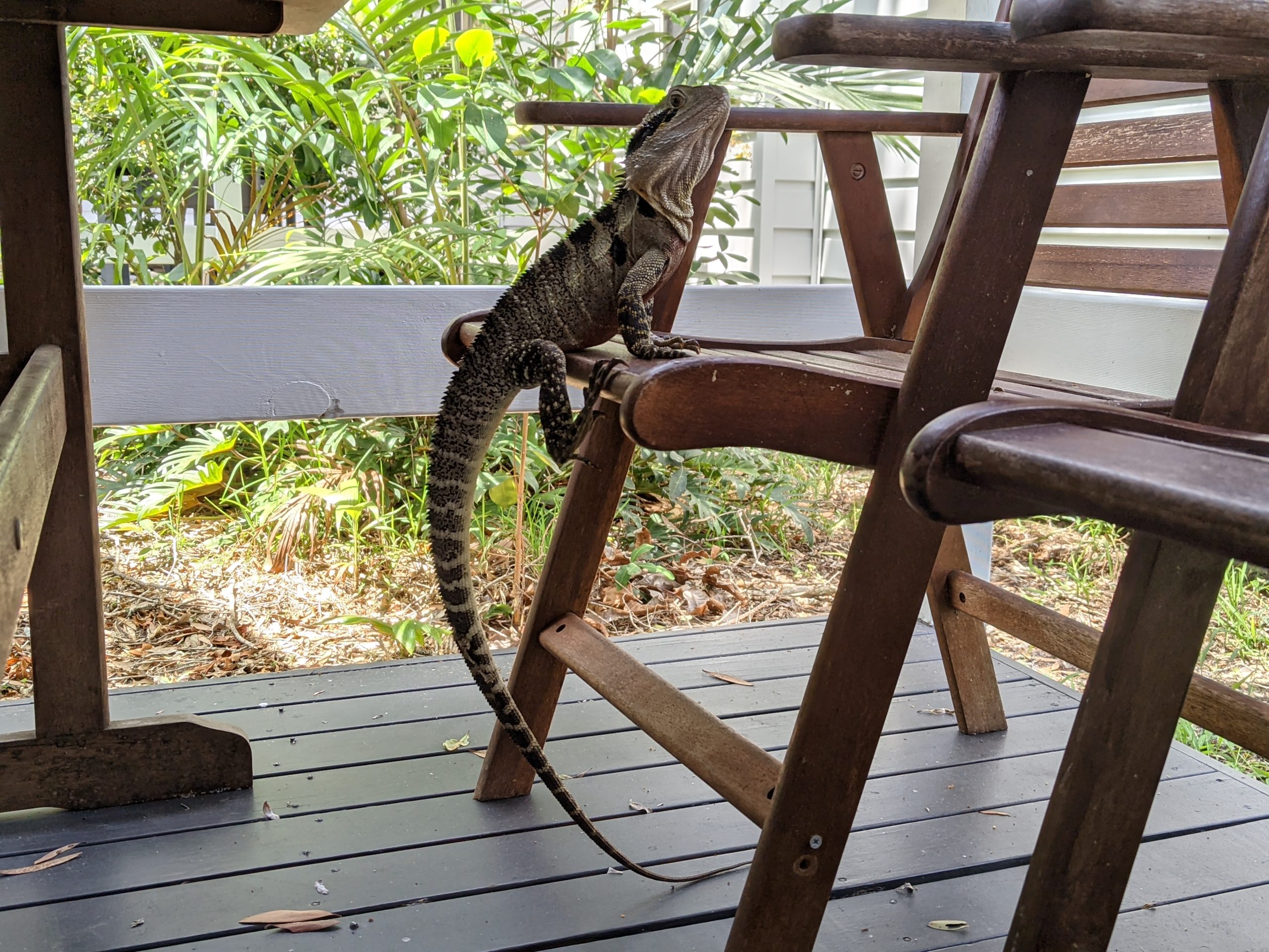 Daarna aan tafel. Snel verzamelen zich een ibis, een kookebarra vogel en een wel hele brutale hagedis. Deze hagedissen kunnen trouwens in geval van nood een uur onder water blijven, las ik. Maar liever zitten ze in het zonnetje op te warmen. Of hij scharrelt onder je, of springt op de stoel naast je. Da’s niet rustig eten meer. Ze eten trouwens vooral insecten, en zijn niet gevaarlijk. Ze hebben natuurlijk wel scherpe nagels en tandjes die ze inzetten als ze het nodig vinden.