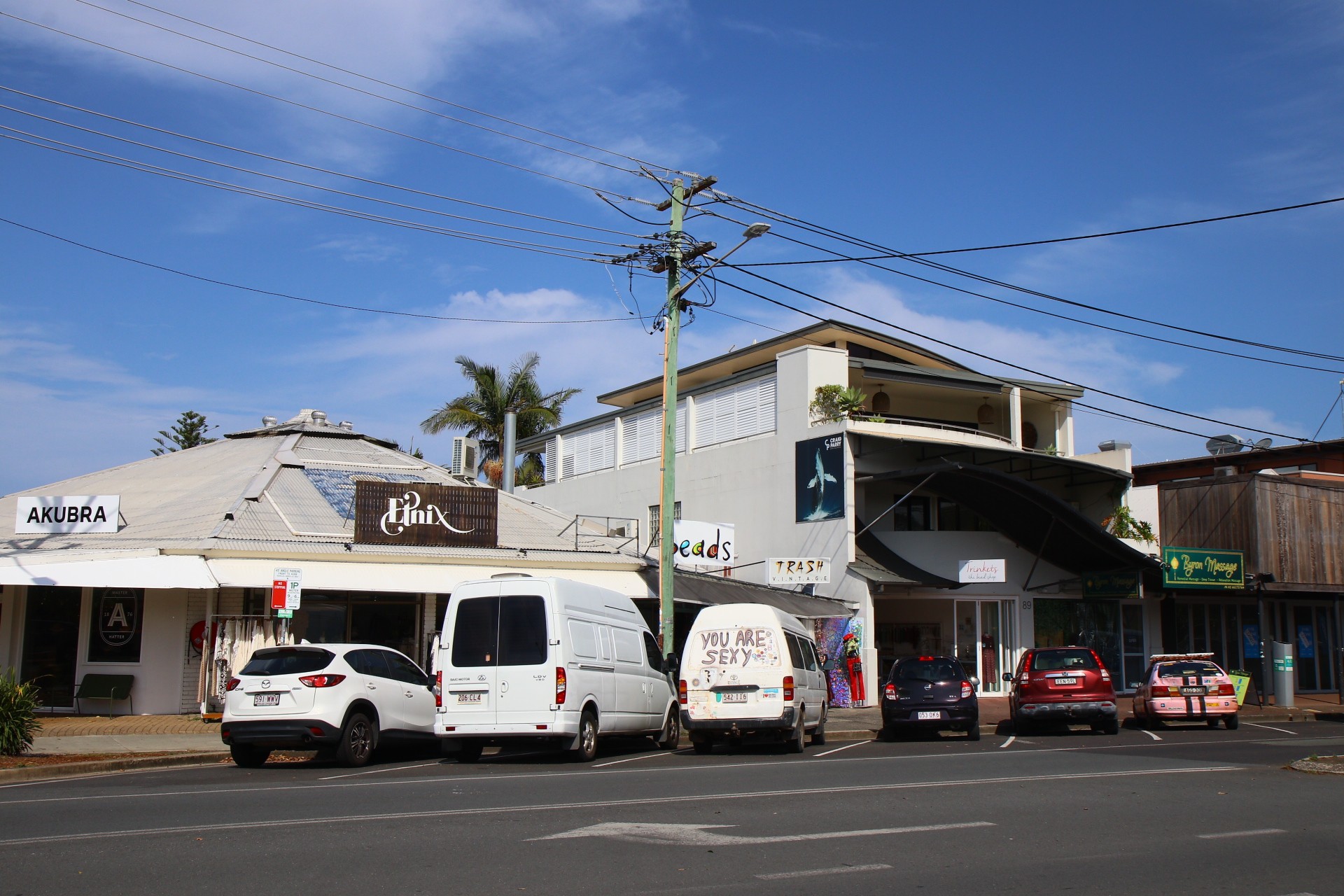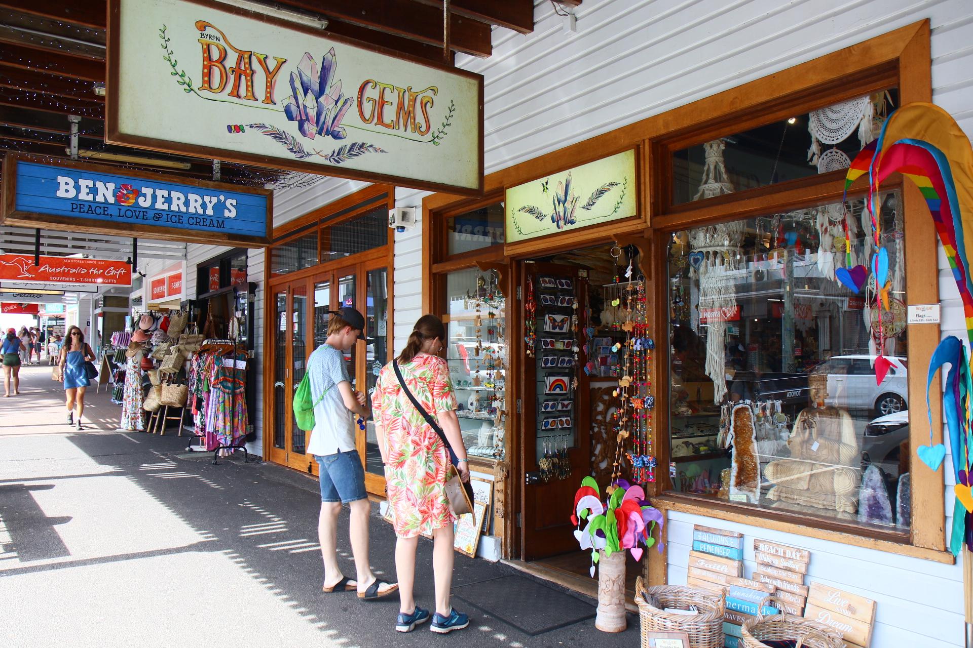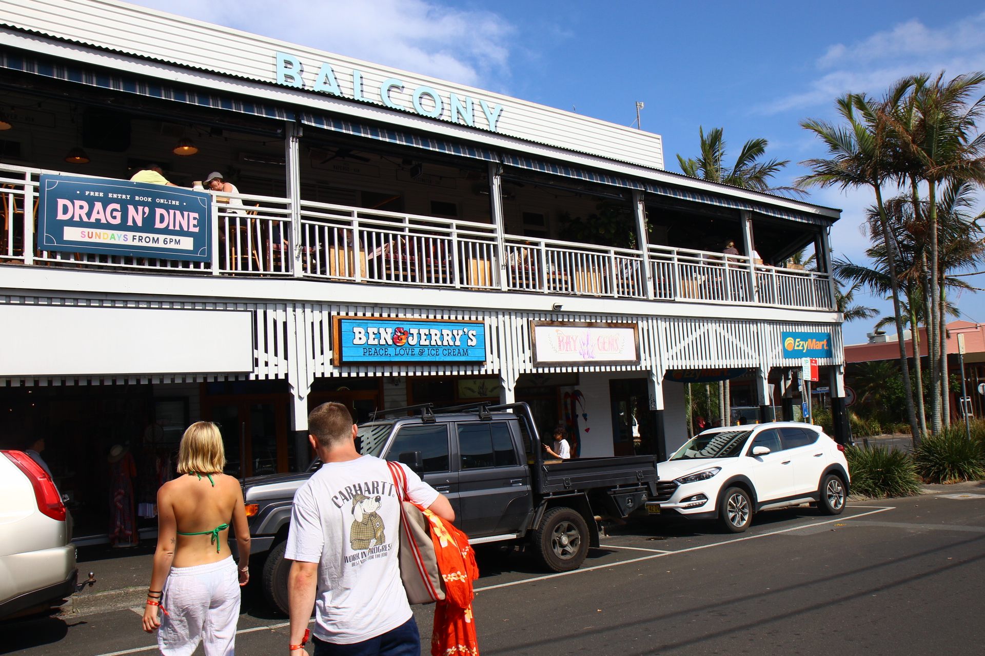 ’s Middags naar het stadje Byron Bay. Vroeger een hippiedorpje, nu het gros standaard commercieel winkelstraat-werk. Nog niet geketend aan de ketens, zoals in Nederland, en nog steeds zie je veel organische en esoterische winkeltjes, aboriginal souvenirs als boemerangs, clap stick en didgeridoo, en surf- en bikinizaken. Ja, en er loopt ook veel jeugd in bikini of blote bast rond. ‘No shirt, no shoes, no service’ geldt hier niet. En veel fatbikes en stepjes hier die tussen de voetgangers door crossen (er zijn hier nauwelijks fietspaden in Australië).