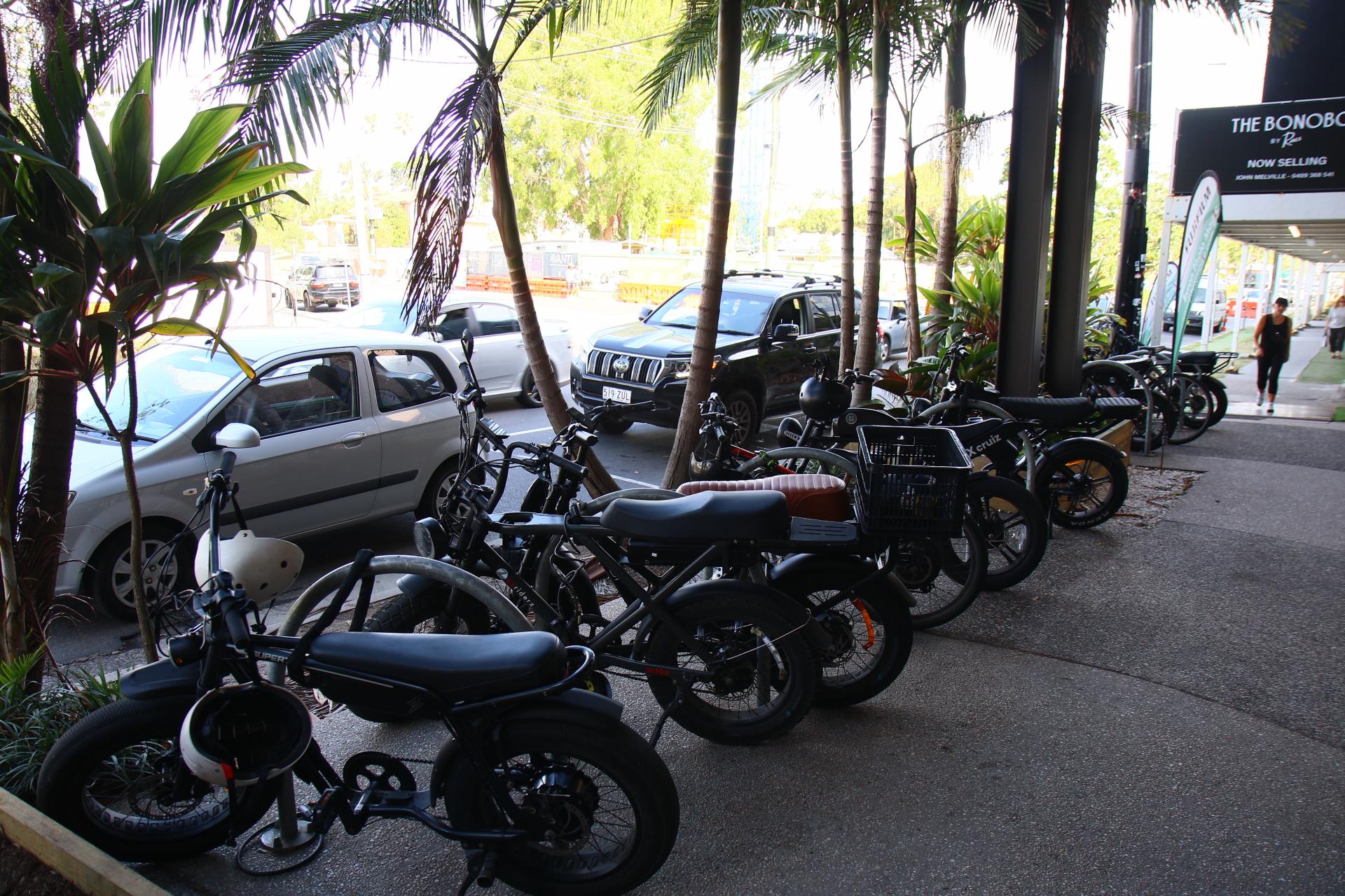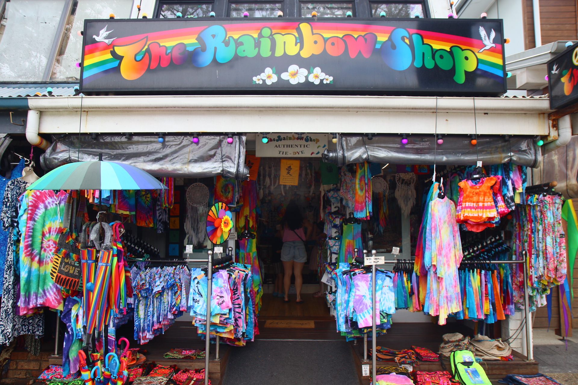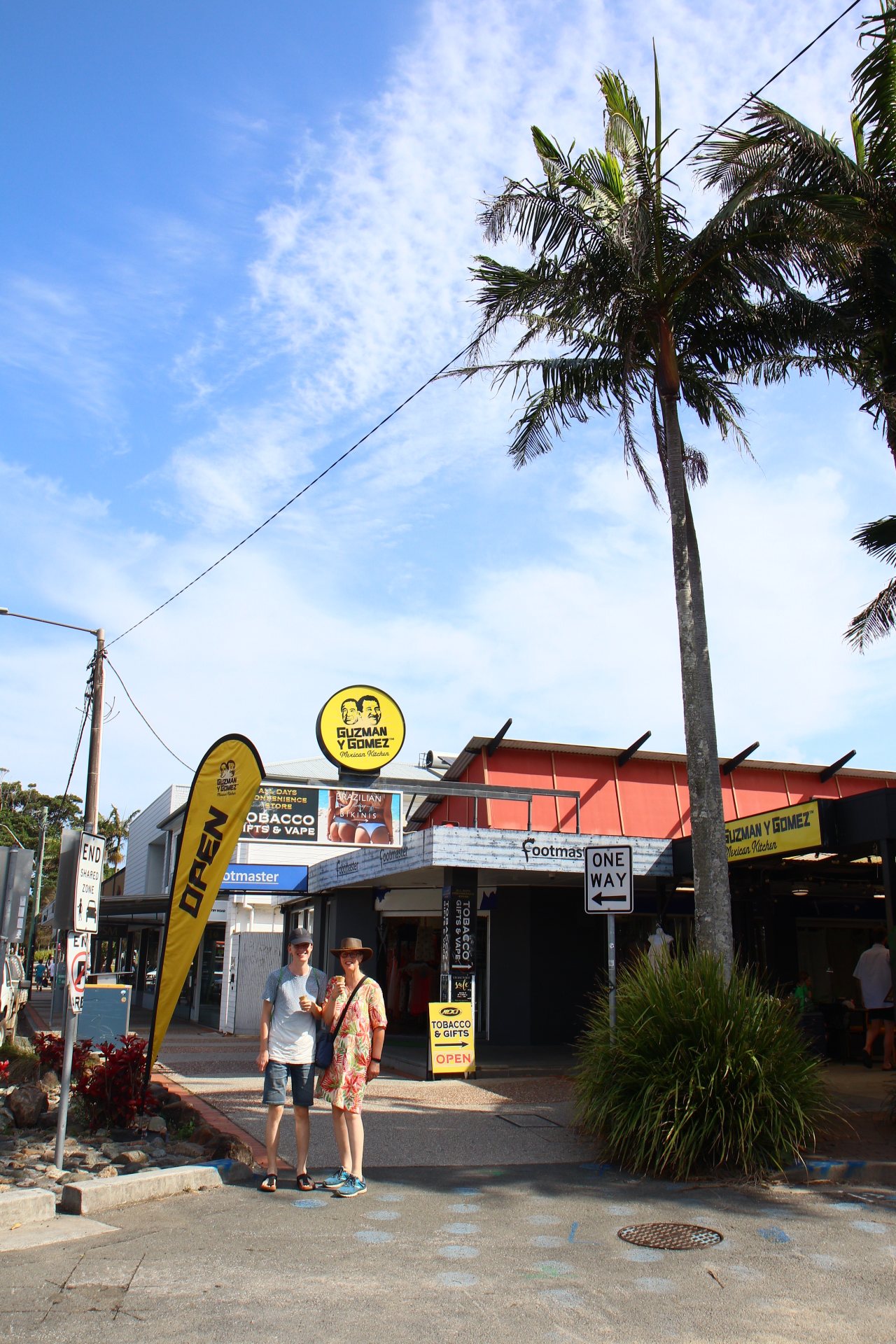 ’s Middags naar het stadje Byron Bay. Vroeger een hippiedorpje, nu het gros standaard commercieel winkelstraat-werk. Nog niet geketend aan de ketens, zoals in Nederland, en nog steeds zie je veel organische en esoterische winkeltjes, aboriginal souvenirs als boemerangs, clap stick en didgeridoo, en surf- en bikinizaken. Ja, en er loopt ook veel jeugd in bikini of blote bast rond. ‘No shirt, no shoes, no service’ geldt hier niet. En veel fatbikes en stepjes hier die tussen de voetgangers door crossen (er zijn hier nauwelijks fietspaden in Australië).