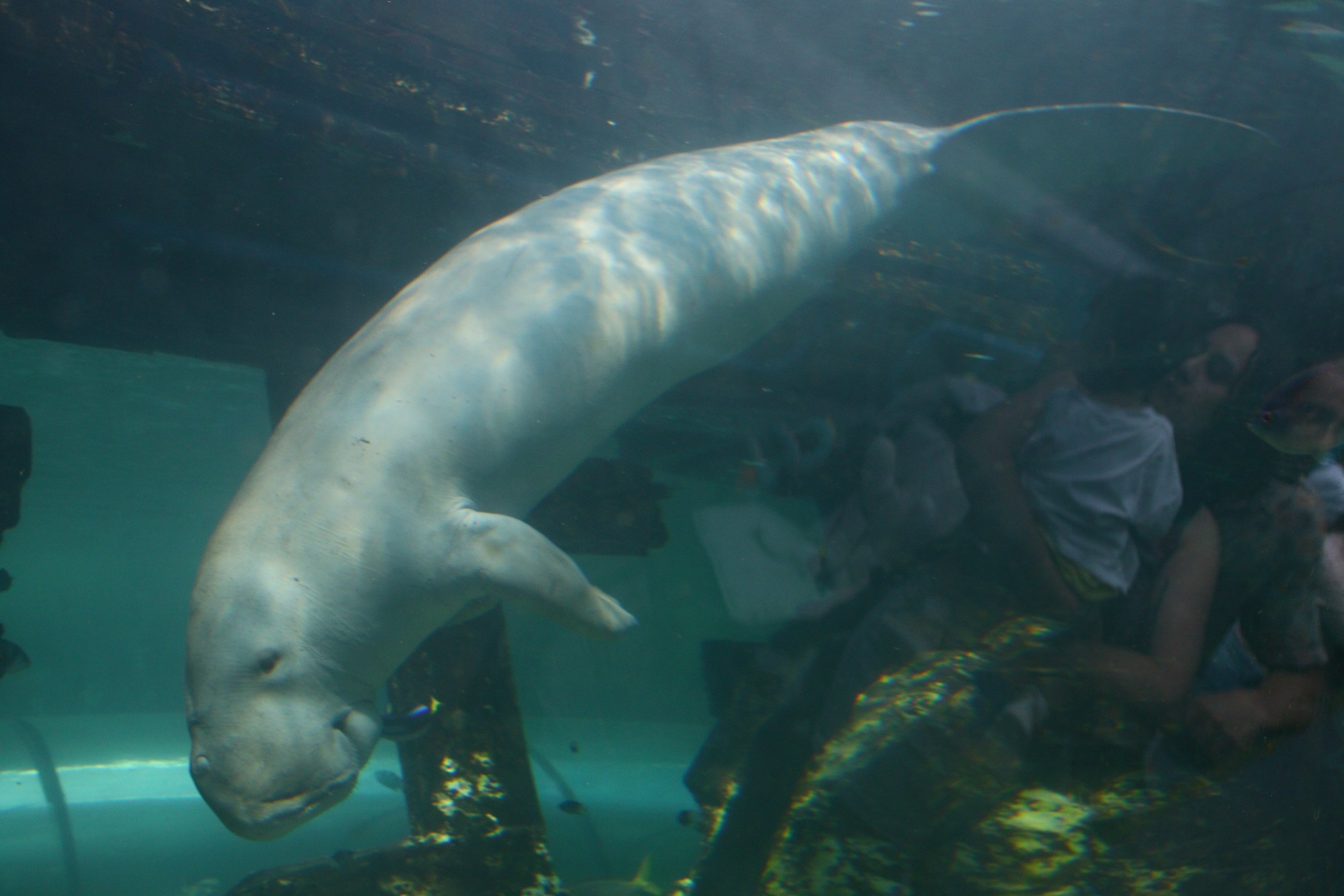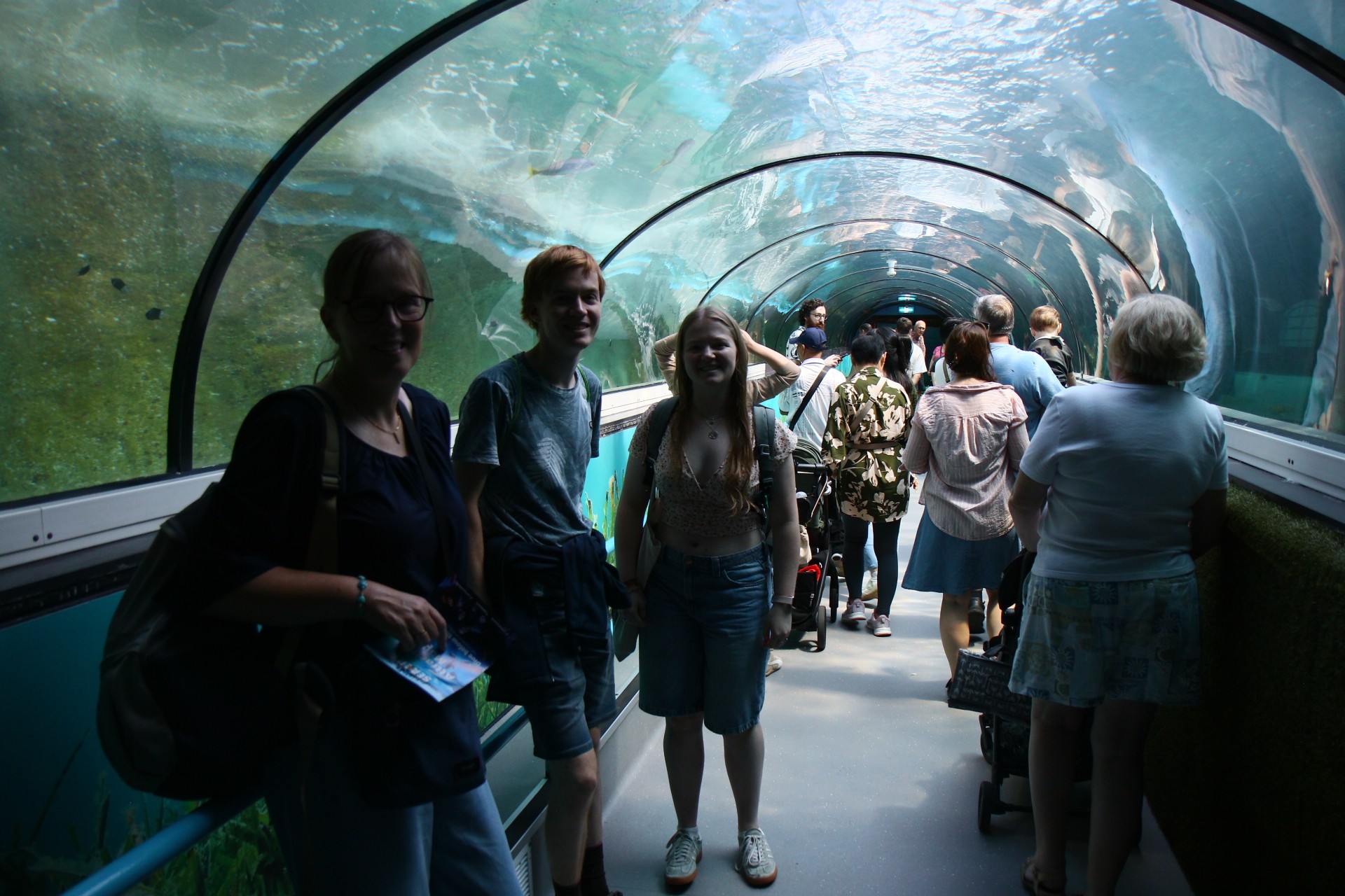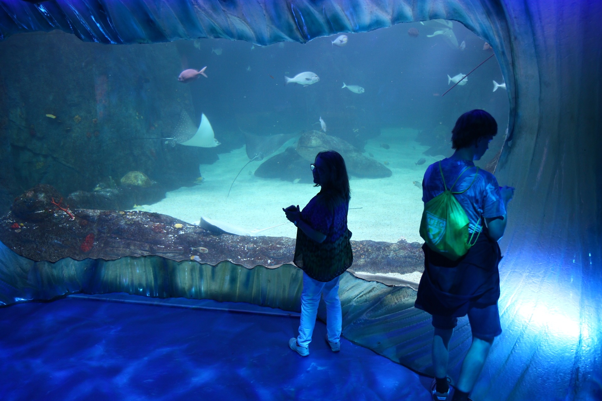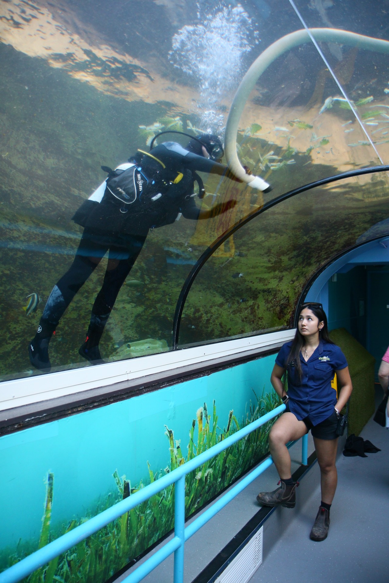 Niet alleen kijkvensters, maar ook hele grote bassins waar je een verdieping naar beneden kan om onderin het te kijken, en door de onderwatertunnels kan lopen.