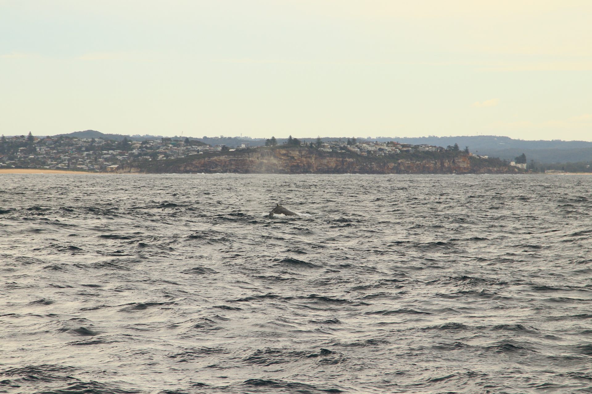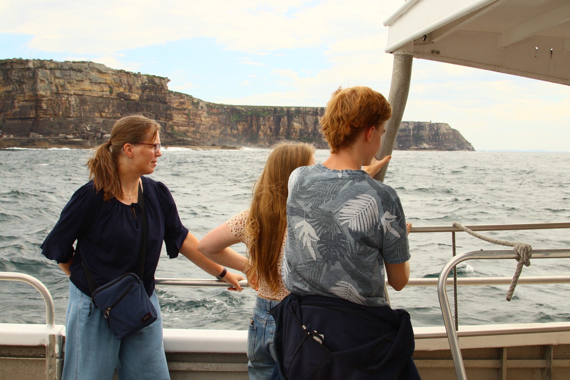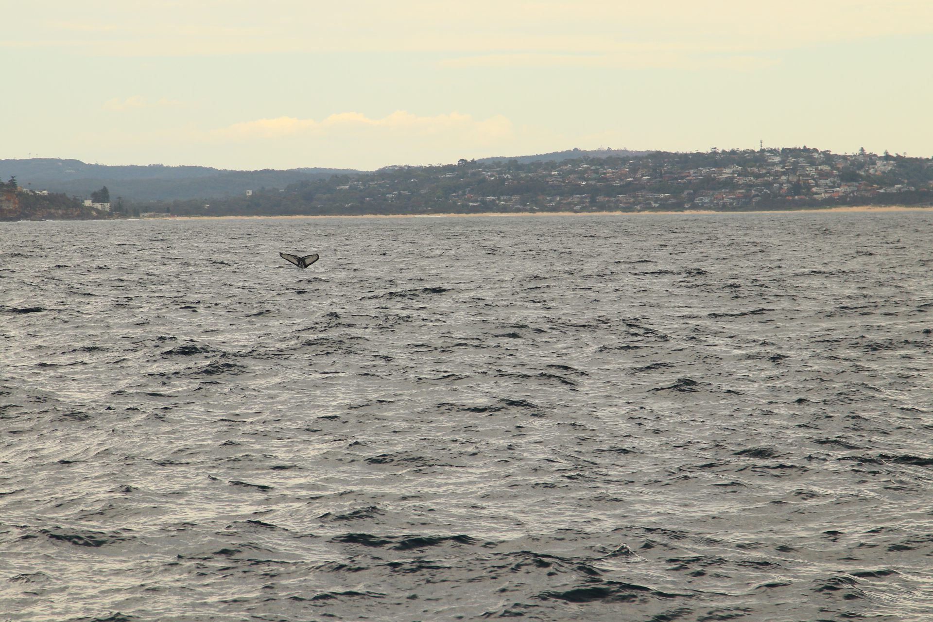 Vroeg op: walvissen kijken. Naar Circular Quay, de haven waar de boot vertrekt. Het was een iets kleiner bootje dan verwacht, zal wel een rocky ride worden. En inderdaad. Eenmaal de rivier uit, na een half uur varen, gaat ie op volle zee flink op en neer: rollen, stampen en gieren tegelijk. A+A worden een beetje misselijk.
