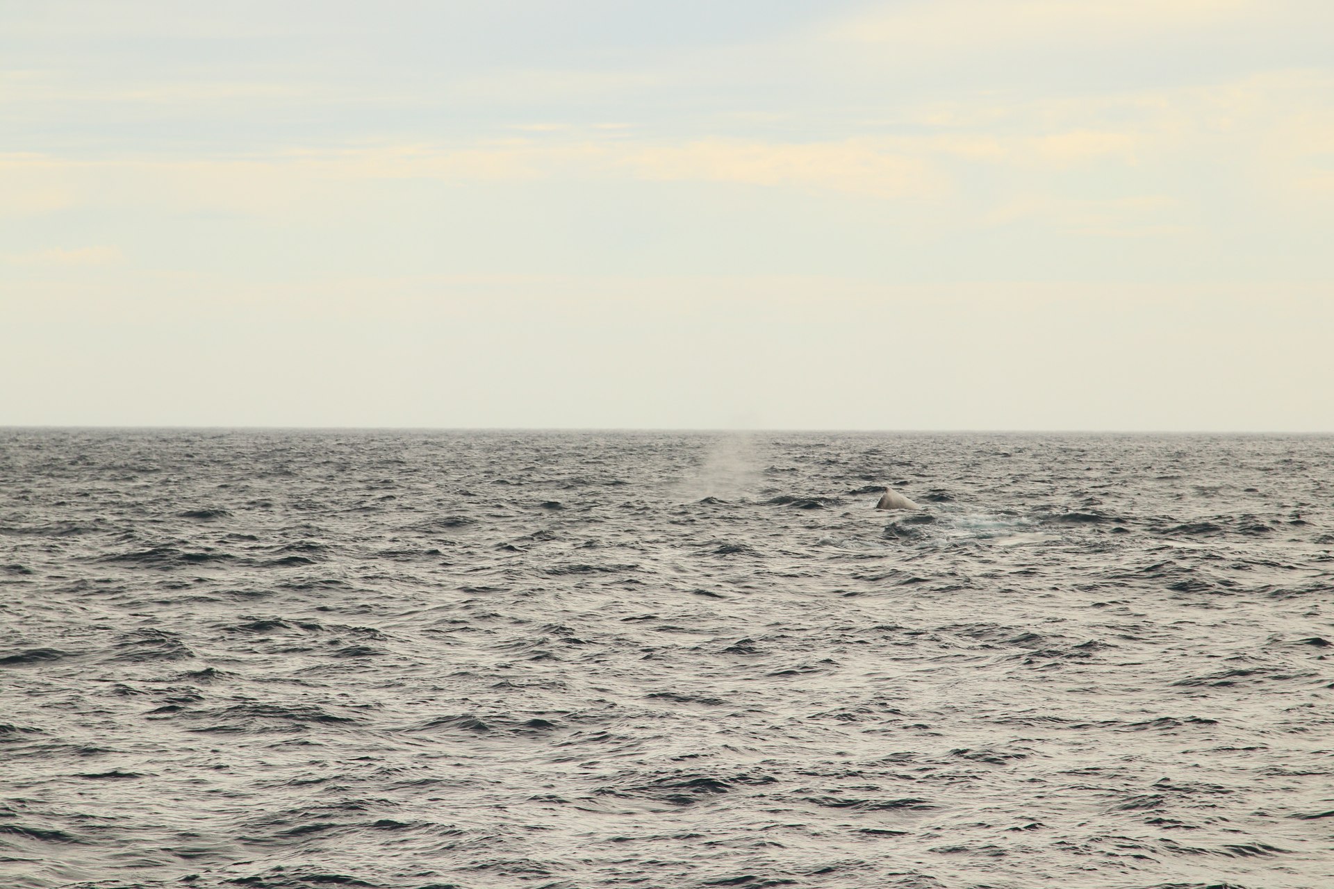 Maar daar zijn de walvissen al! Direct uit de riviermonding zijn de beesten al te zien. Diverse walvissen op diverse plekken, toegegeven, wel op aardige afstand. Spuiten, de rug laten zien, een vin uit het water doen, of de staart laten zien, we worden van alles blij.