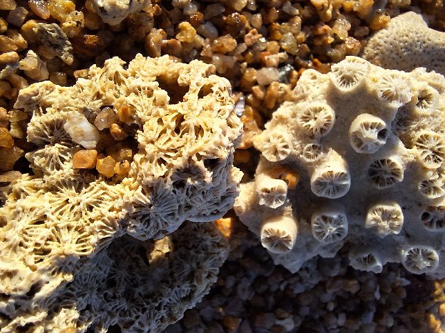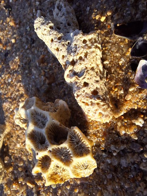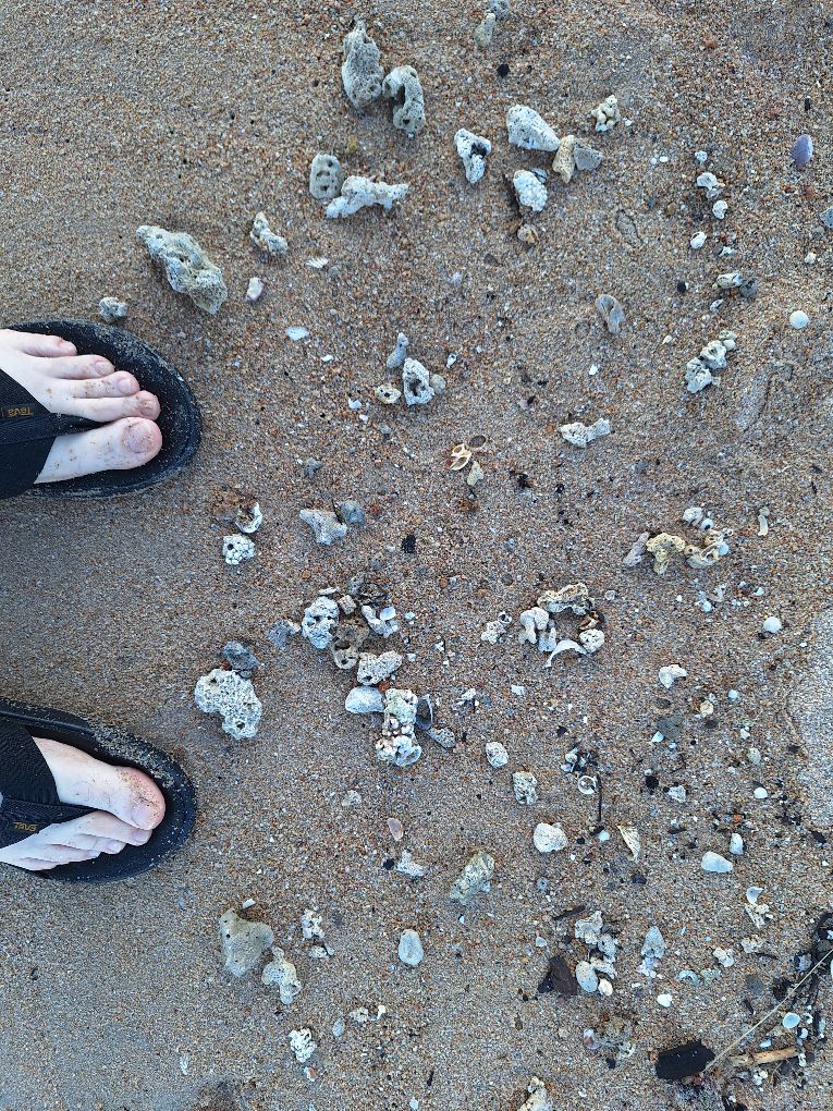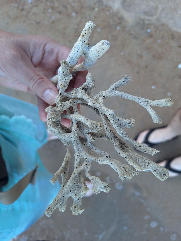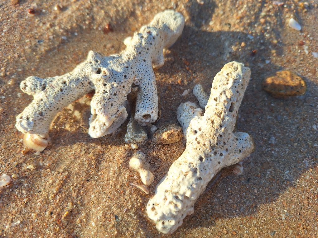 Over strand naar de rotsen aan het eind van de baai gelopen. Overal op strand liggen stukken koraal, de meeste hard als steen, sommige zacht als vilt/spons.